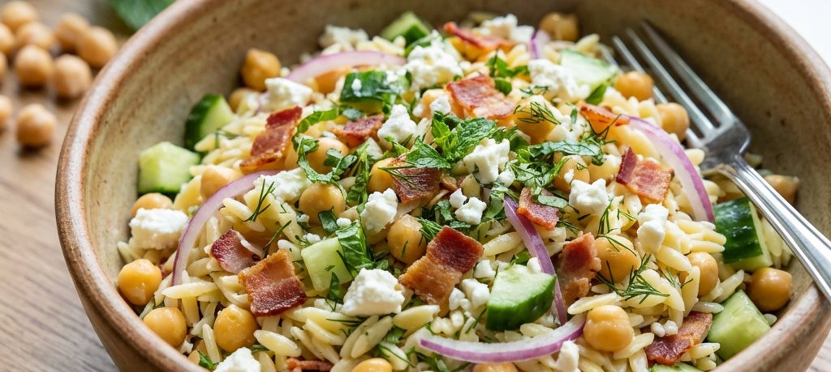 - 2Die gekochten Orzo-Nudeln abgießen und in eine große Salatschüssel geben. Die abgetropften Kichererbsen, die gewürfelte Salatgurke, die fein gehackten Kräuter (Minze und Dill), die in feine Halbringe geschnittene rote Zwiebel, den zerbröselten Feta und den in kleine Stücke gebrochenen Bacon hinzufügen.