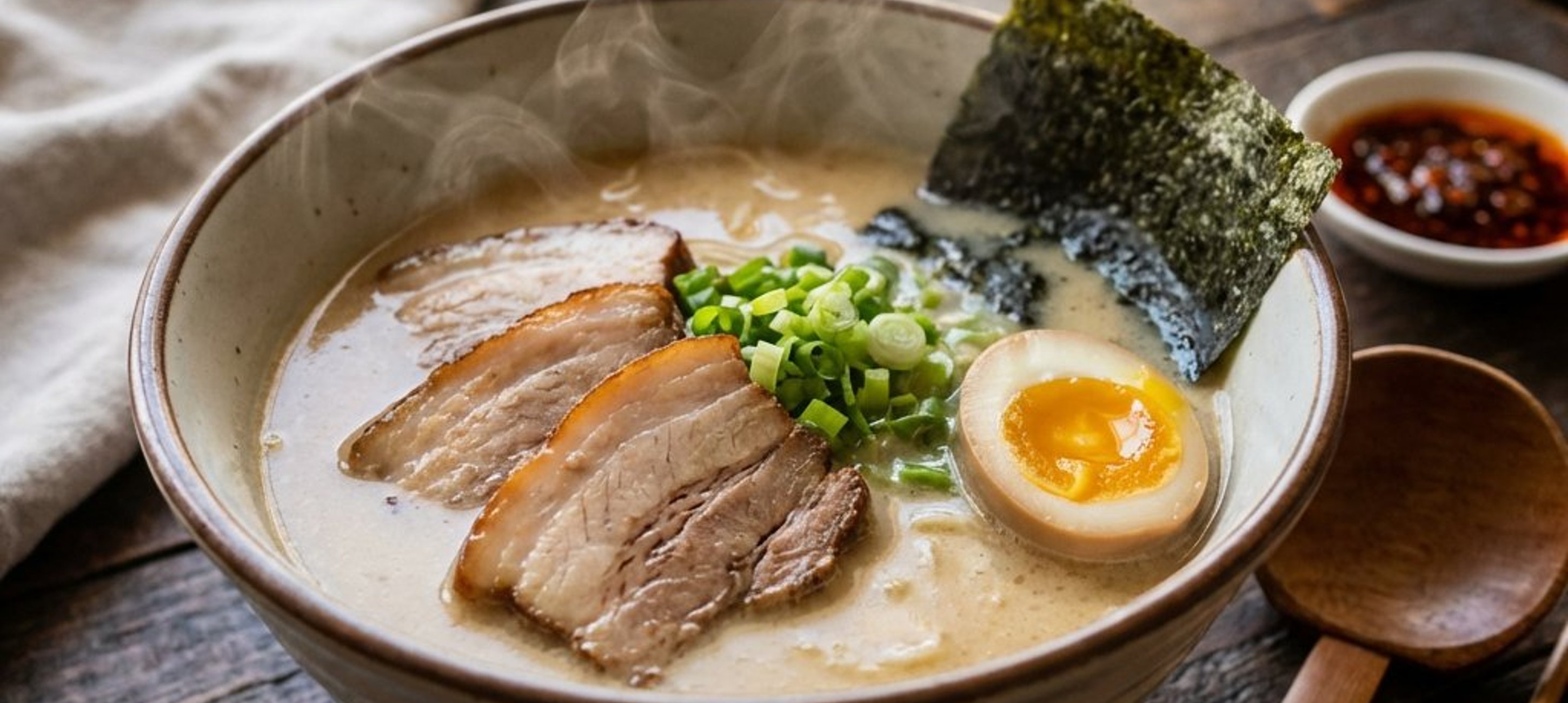 - 1Während die Brühe köchelt, die marinierten Eier (in einer Mischung aus Sojasauce, Mirin und Wasser) und den Schweinebauch (langsam gegart oder geschmort) vorbereiten.