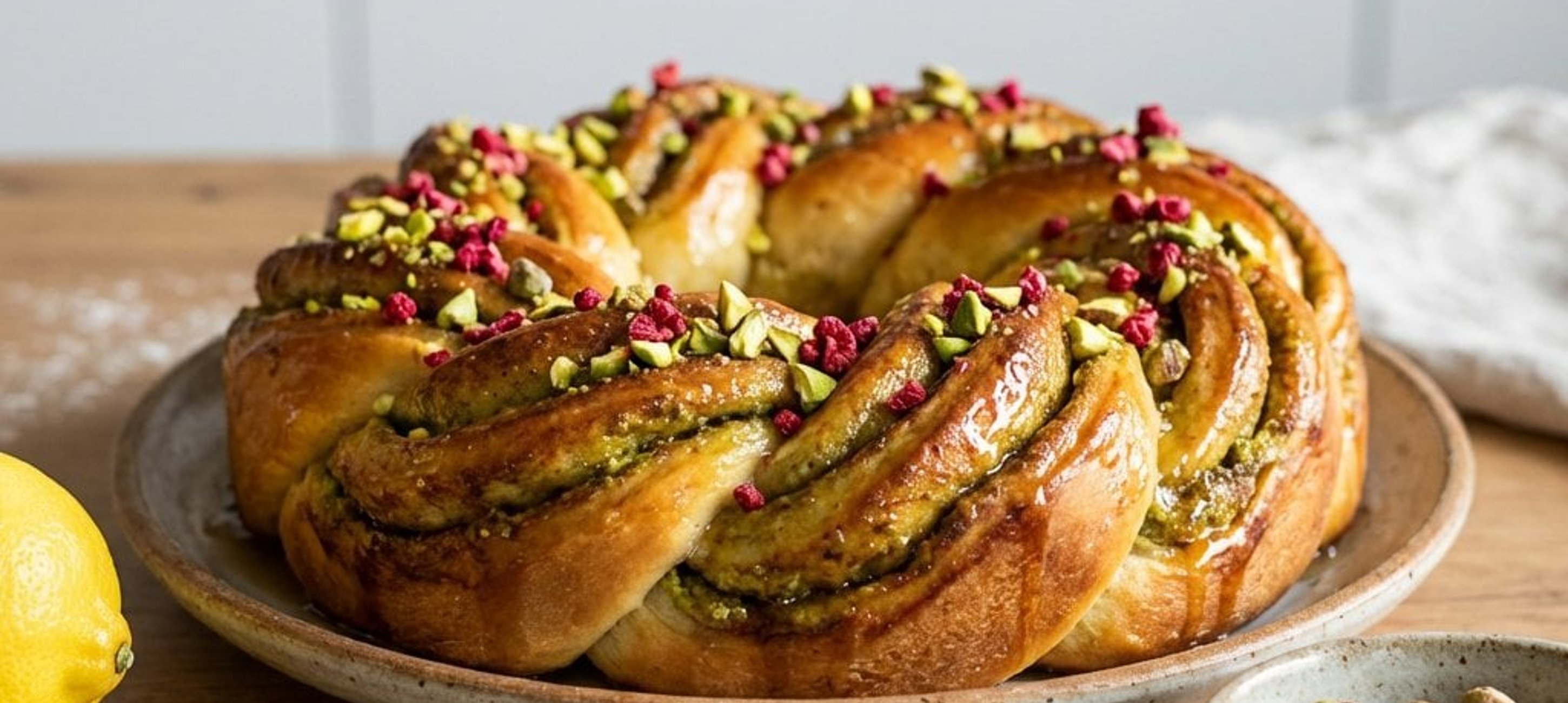 - 2Den aufgegangenen Teig auf einer bemehlten Arbeitsfläche zu einem Rechteck ausrollen. Mit der Pistazienfüllung bestreichen (nach Belieben mit zerbröselten gefriergetrockneten Früchten bestreuen) und fest aufrollen. Die Rolle längs aufschneiden und die beiden Stränge zu einem Zopf flechten. Zu einem Kranz formen und in eine mit Backpapier ausgelegte Springform legen. Weitere 20 Minuten gehen lassen.