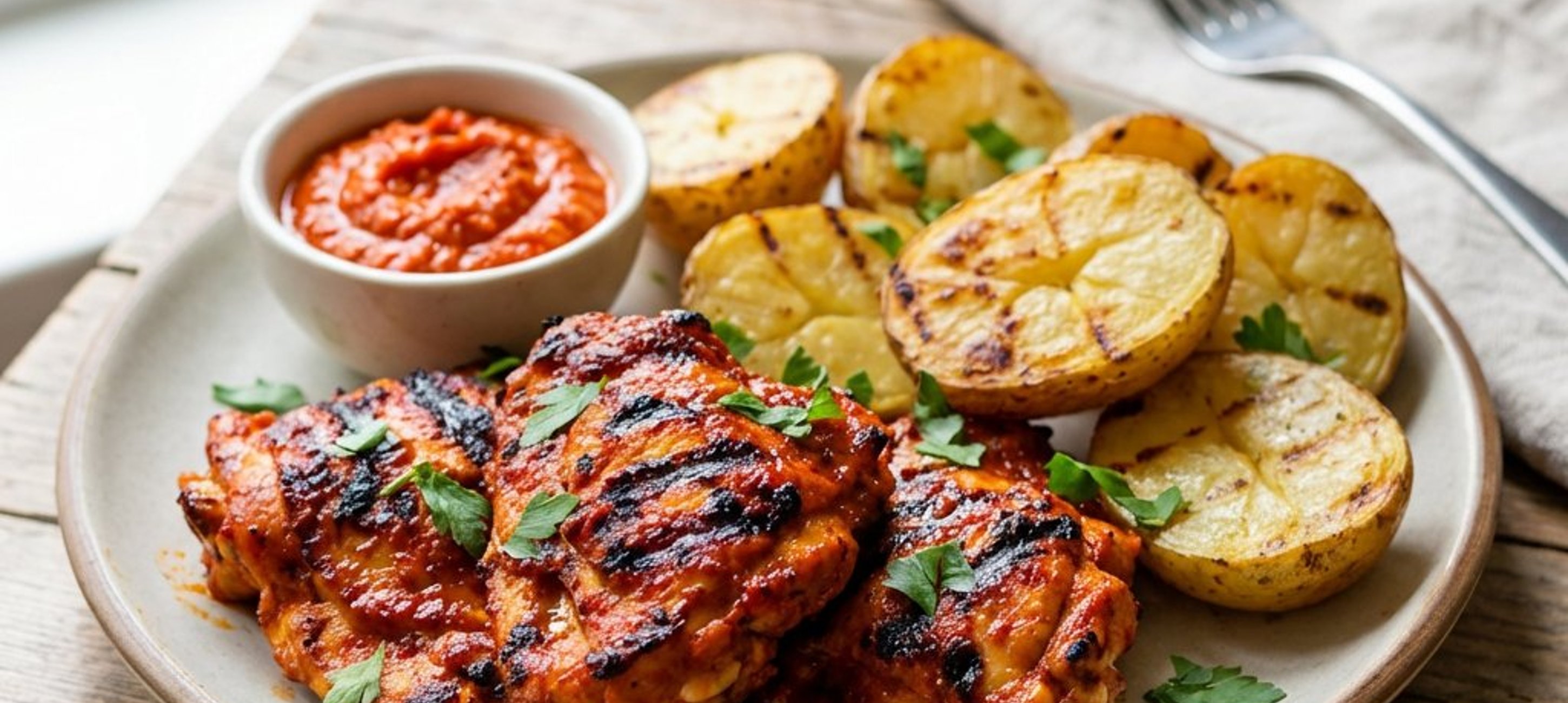- 3Die Kartoffeln mit der Schnittseite nach unten auf den Grill legen und grillen, bis sie eine goldbraune Kruste bekommen. Das fertige Fleisch und die Kartoffeln zusammen mit dem beiseite gestellten Dip servieren und nach Belieben mit frischer Petersilie garnieren.