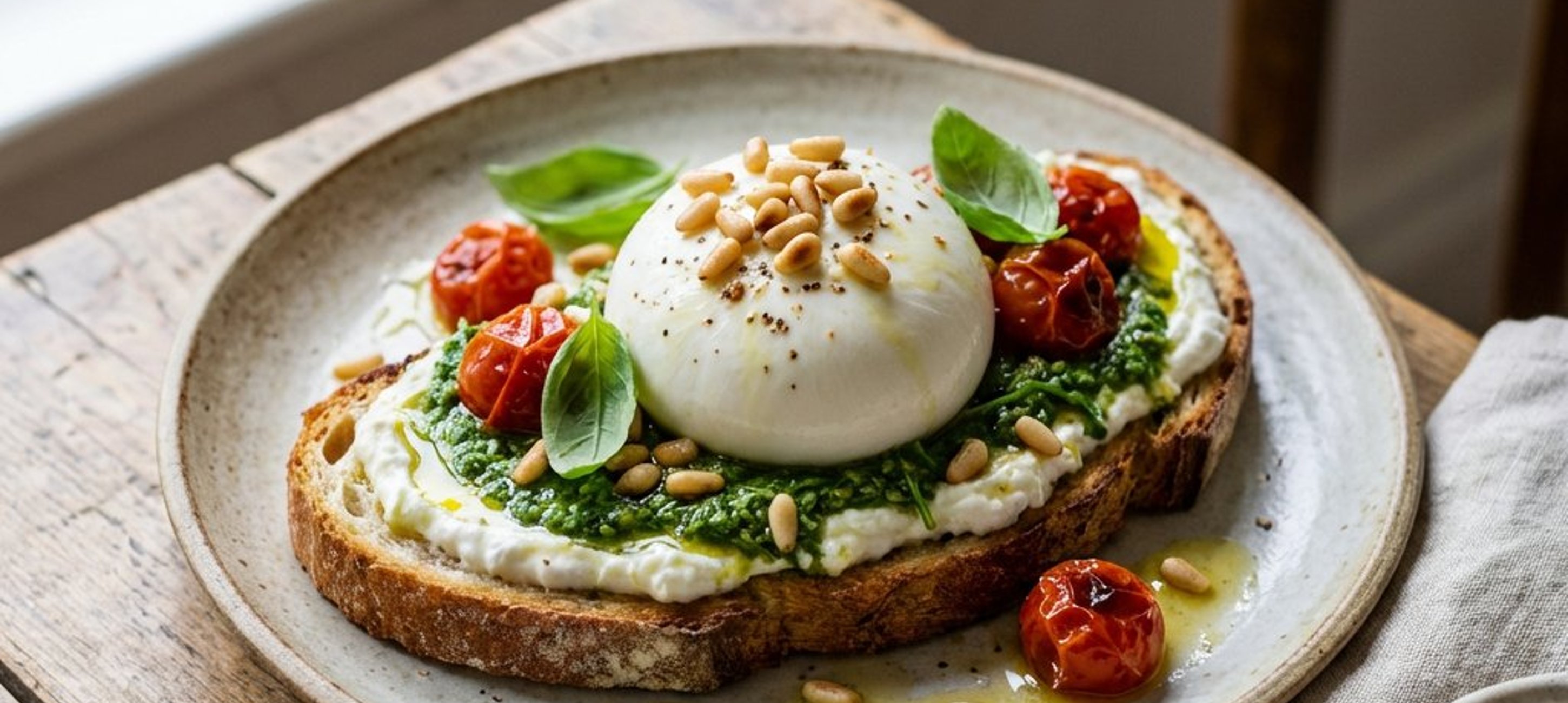 - 3Die Burrata-Kugel in die Mitte setzen und leicht einschneiden. Mit den gerösteten Pinienkernen und den warmen Kirschtomaten garnieren. Nach Belieben mit etwas Olivenöl beträufeln und servieren.