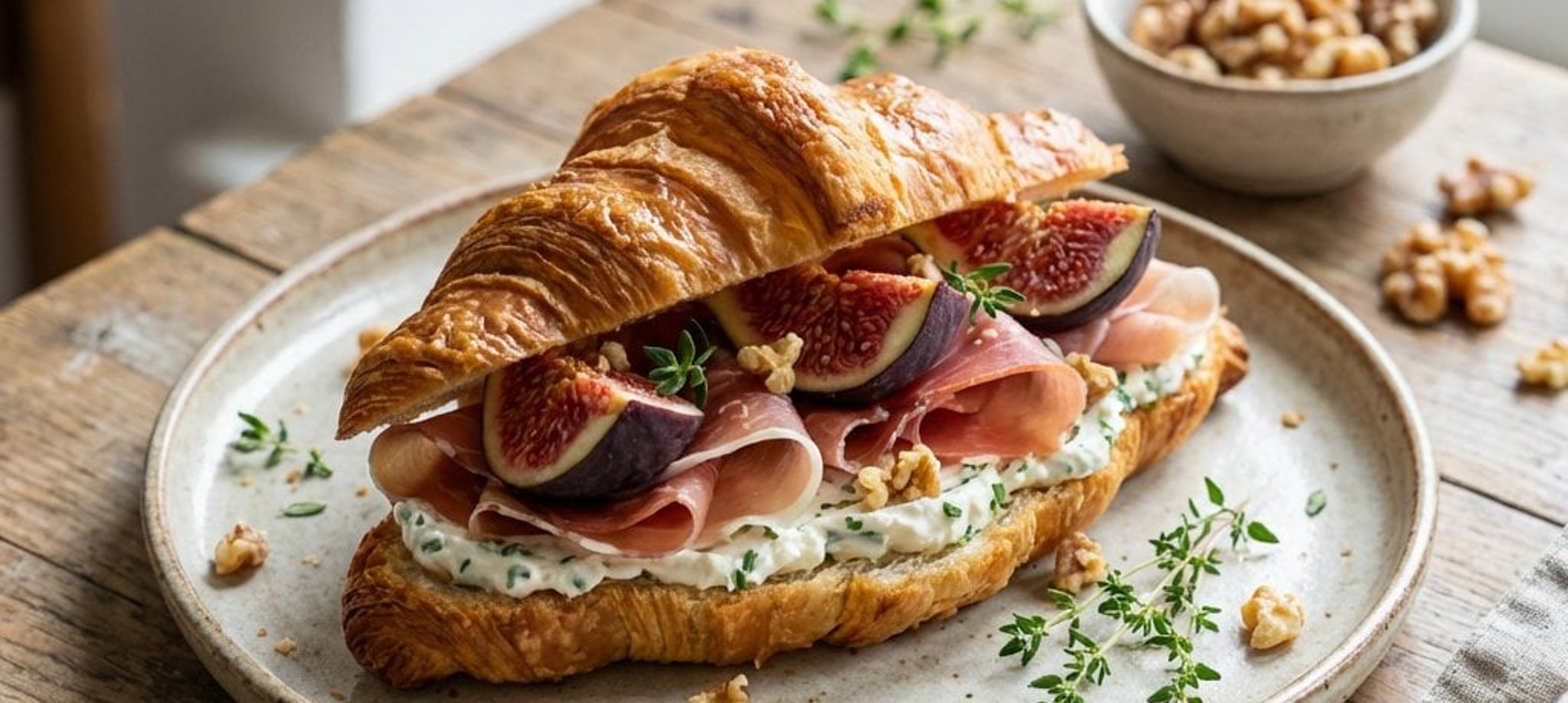 - 4Zum Schluss mit frischen Thymianblättchen und den karamellisierten Walnüssen bestreuen. Nach Belieben können auch in Scheiben geschnittene Erdbeeren hinzugefügt werden. Die Croissants eignen sich auch hervorragend für unterwegs – einfach mit einem Holzspieß fixieren oder in Pergamentpapier einwickeln.
