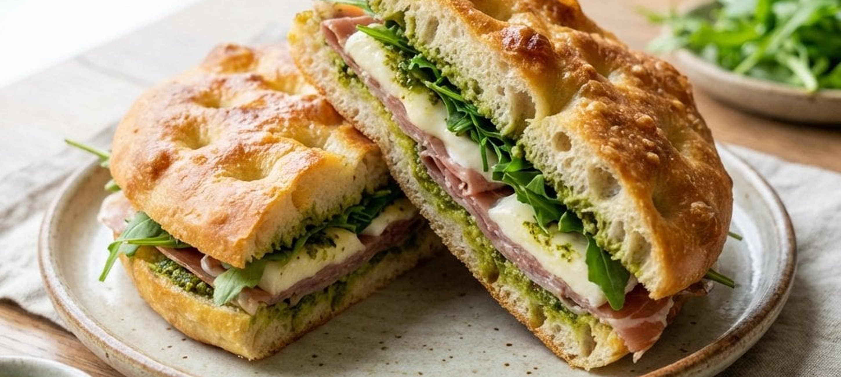 - 1Von der abgekühlten Focaccia ein Stück abschneiden und längs halbieren. Beide Hälften mit Pesto bestreichen. Auf eine Hälfte eine Handvoll Rucola, Prosciutto-Scheiben, in Scheiben geschnittenen Mozzarella und Basilikumblätter legen. Mit der zweiten Hälfte abdecken. Zum einfacheren Servieren in Backpapier einwickeln, in der Mitte durchschneiden und sofort genießen.