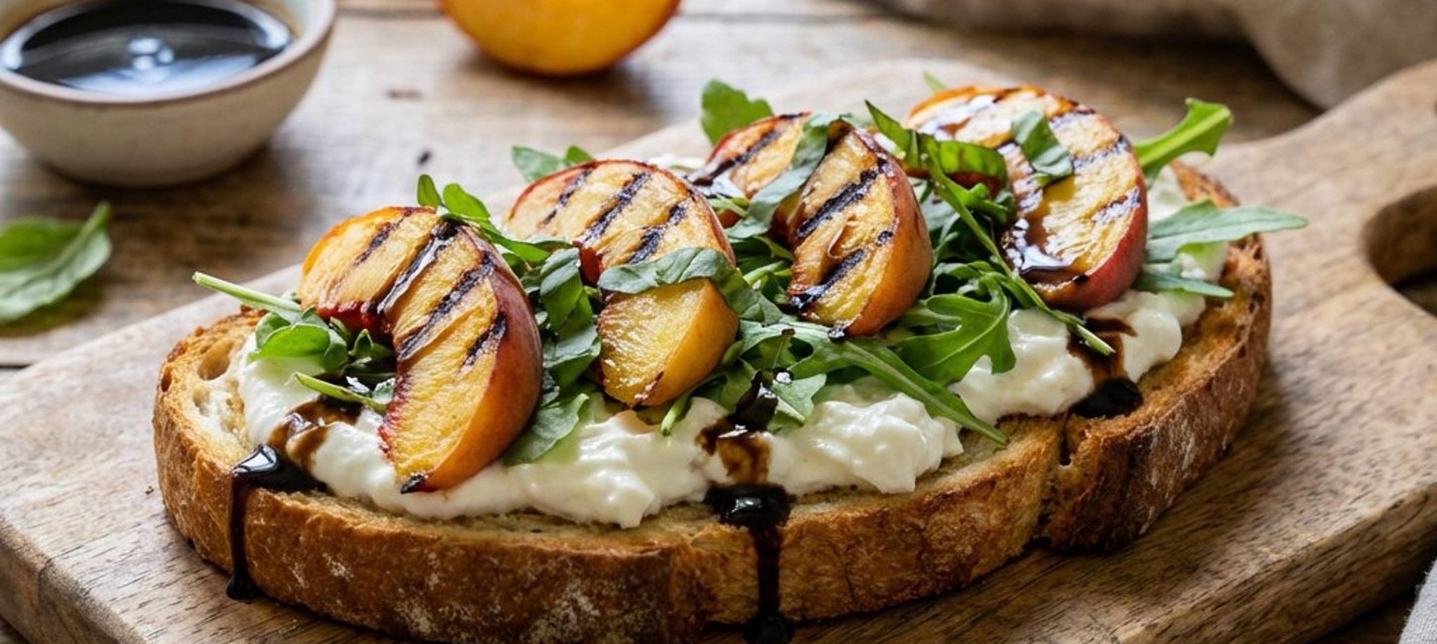 - 3Die gerösteten Brotscheiben auf Tellern anrichten. Die Burrata vorsichtig halbieren oder zerzupfen und auf dem Brot verteilen. Mit Rucola und den warmen Pfirsichspalten belegen.