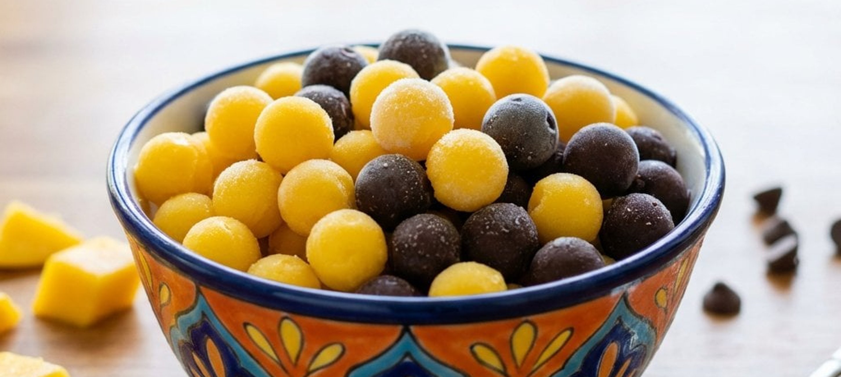 - 4Das Perleneis über Nacht im Gefrierfach fest werden lassen. Vor dem Servieren die gefrorenen Perlen vorsichtig vom Papier lösen und in Schälchen anrichten. Sofort genießen!