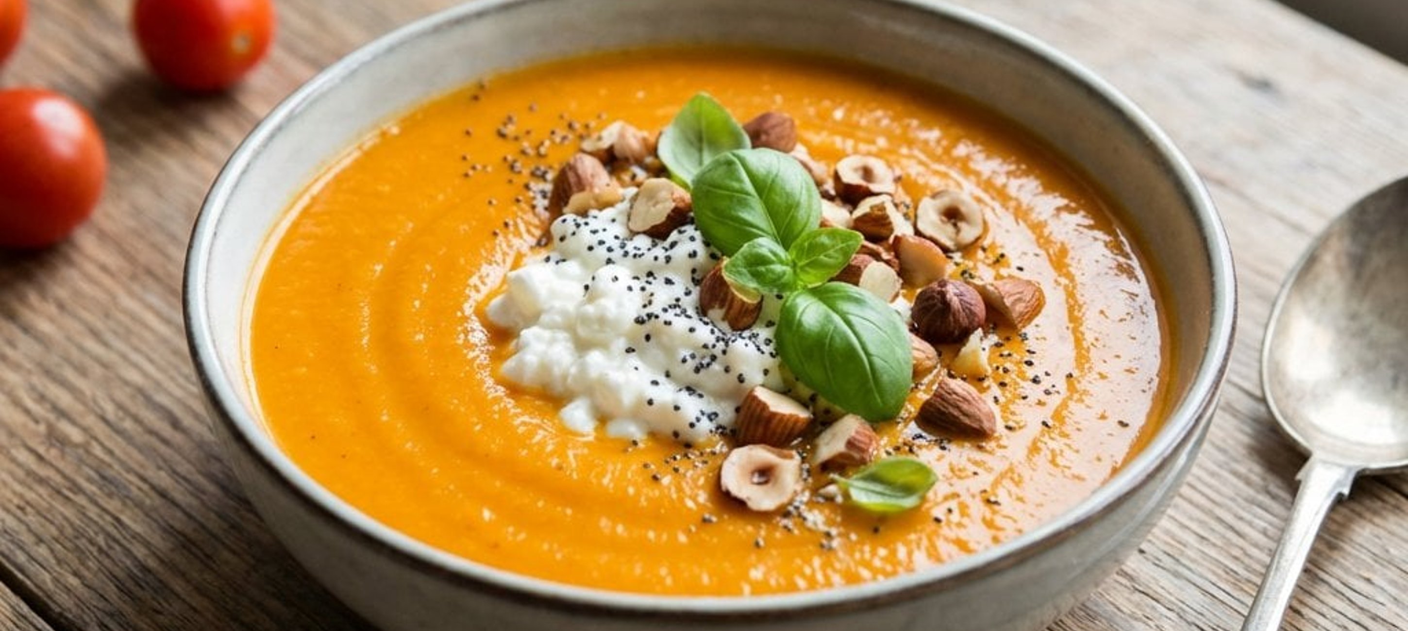 - 1Das geröstete Gemüse in einen Standmixer geben. Die Gemüsebrühe und den Hüttenkäse hinzufügen und alles zu einer glatten Creme mixen. Mit Salz und Pfeffer abschmecken. Die Suppe in Schalen füllen und mit dem Nuss-Mohn-Topping sowie frischem Basilikum garniert servieren.