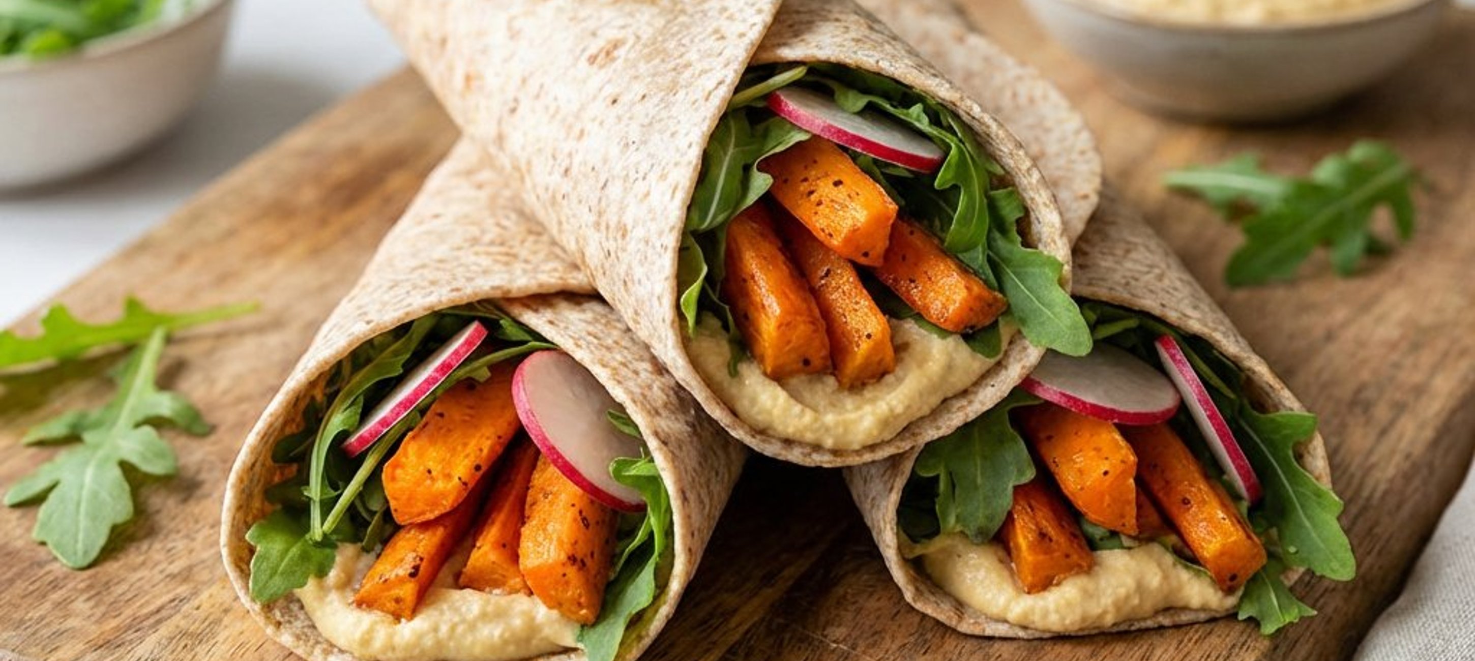 - 5Die Wraps mit Rucola, den gerösteten Karotten und den Radieschenscheiben belegen. Mit etwas frisch gemahlenem Pfeffer bestreuen.