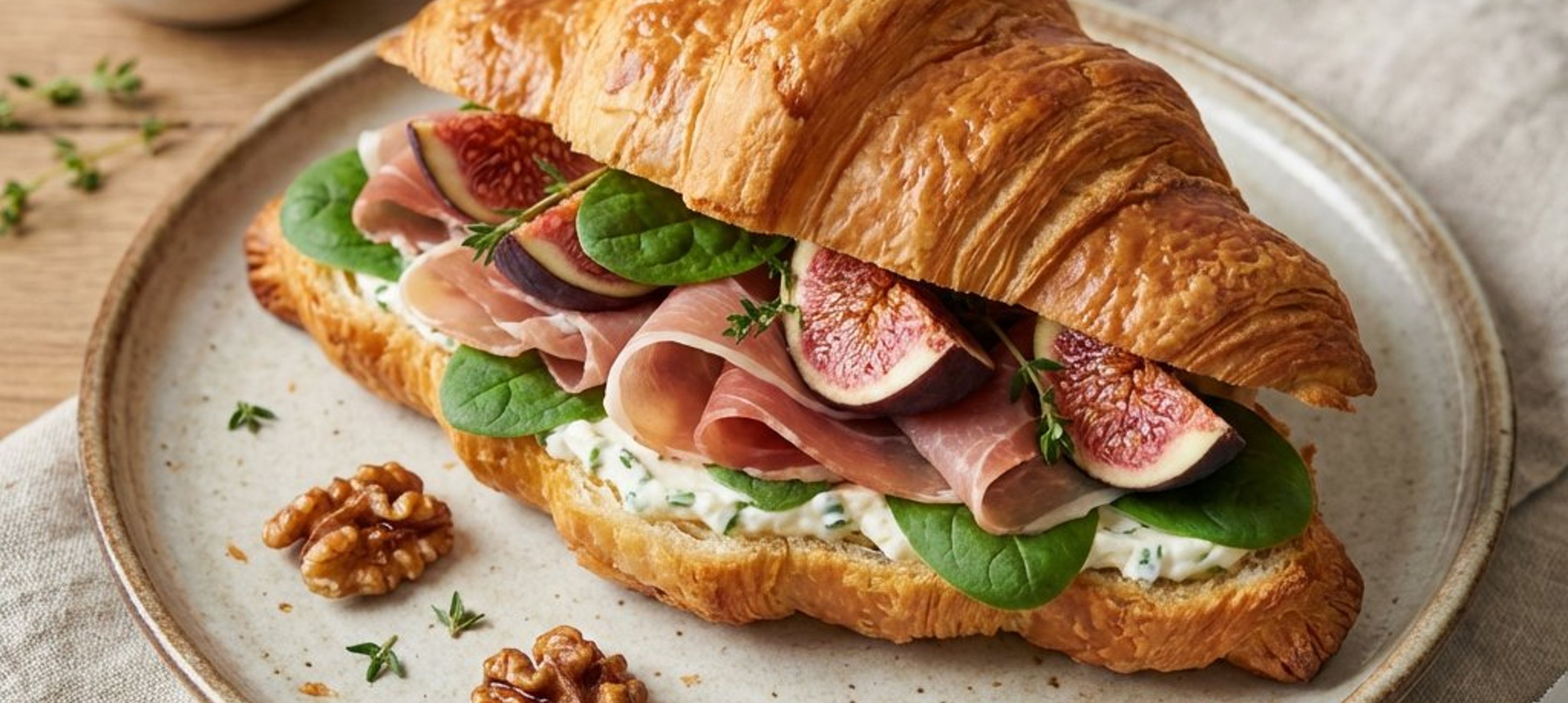 - 3Die Croissants längs aufschneiden. Die Unterseiten großzügig mit der Schnittlauchcreme bestreichen. Mit Babyspinat, Prosciutto-Scheiben und in Spalten geschnittenen Feigen belegen. Mit frischem Thymian und den karamellisierten Walnüssen bestreuen.