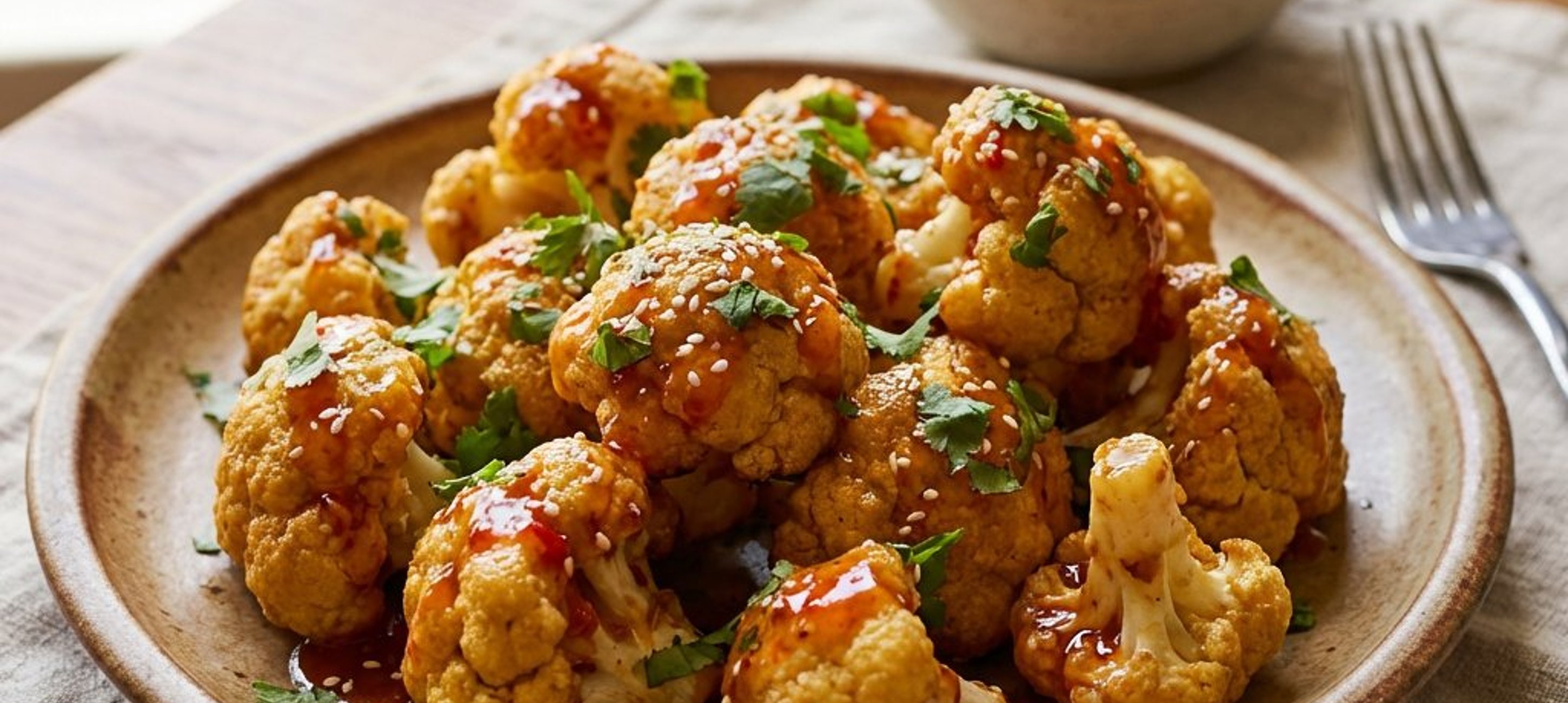 - 7Sobald der Blumenkohl fertig gebacken ist, die Röschen mit der vorbereiteten Sauce bestreichen oder die Sauce separat als Dip dazu servieren. Warm genießen!