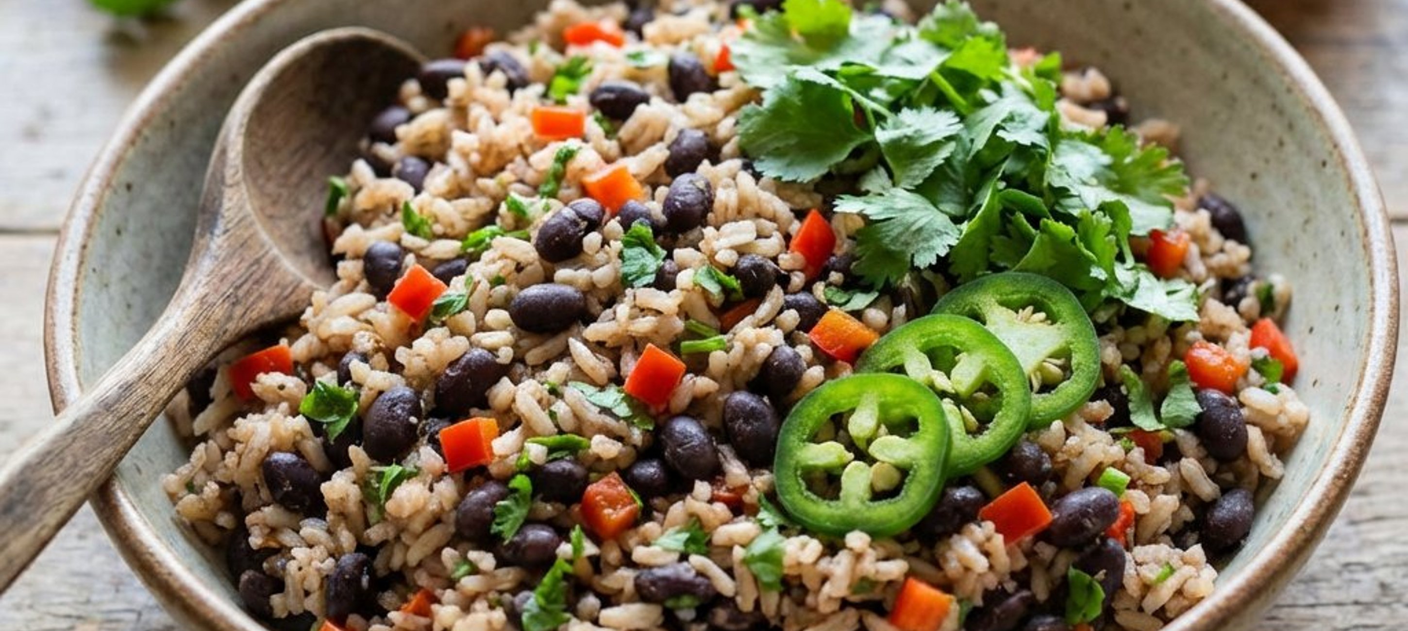 - 3Den bereits gekochten Naturreis vorsichtig unterrühren und etwa 2 Minuten mitgaren, bis alle Zutaten gut vermischt und heiß sind. Kurz vor dem Servieren den gehackten Koriander, die gewürfelte Paprika und die Jalapeño unterheben. Mit Salz und Pfeffer abschmecken.