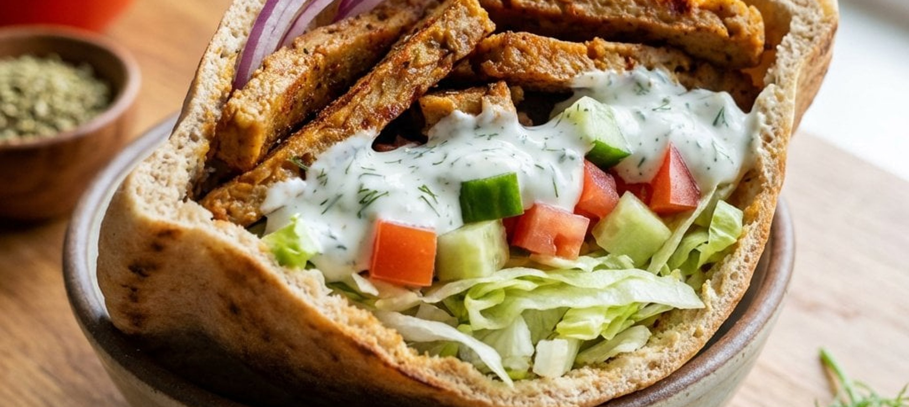 - 3Olivenöl in einer Pfanne erhitzen. Die pflanzlichen Gyros-Streifen hinzufügen, mit Oregano und geräucherter Paprika würzen und für ca. 5-6 Minuten goldbraun und knusprig anbraten. Mit Salz und Pfeffer abschmecken.