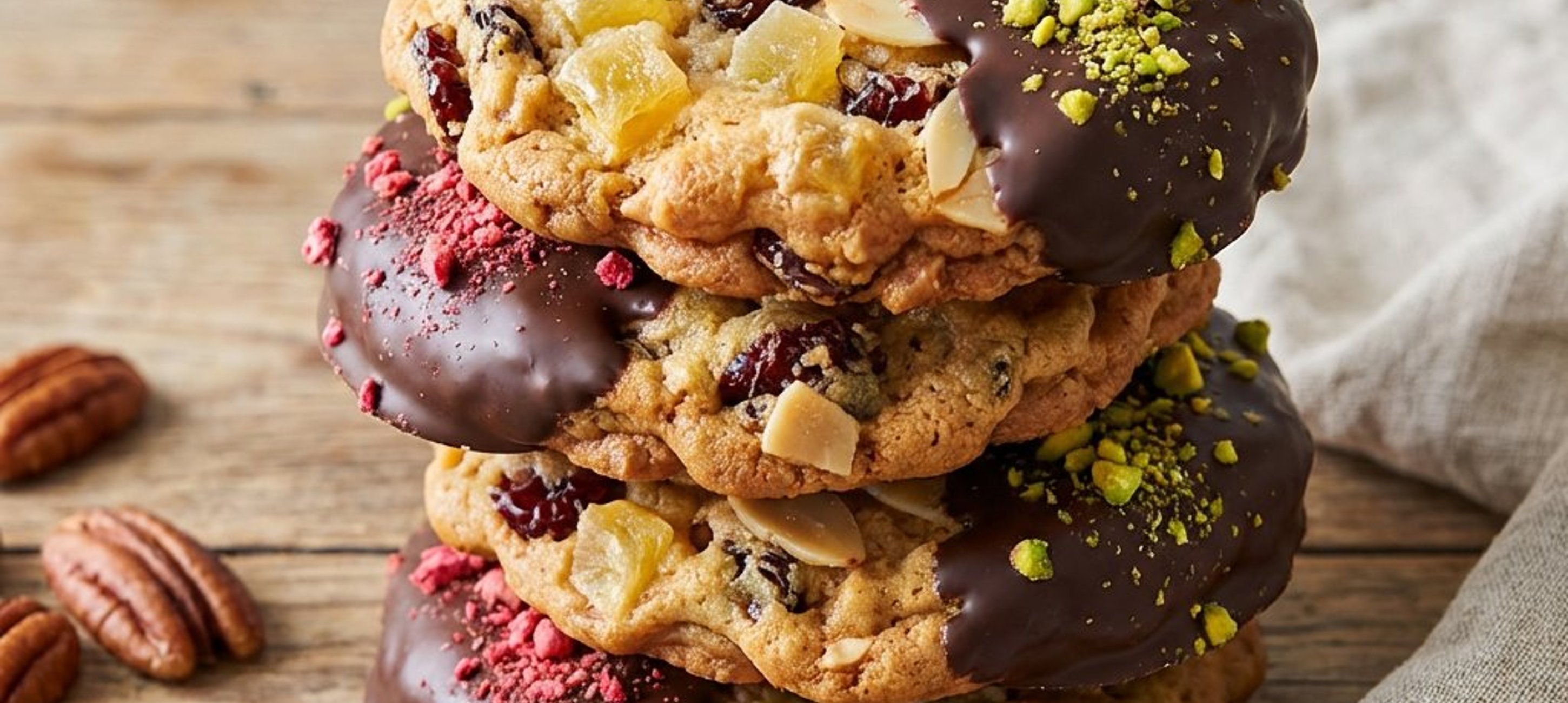 - 1Die Zartbitterschokolade im Wasserbad schmelzen. Die Florentiner auf der Unterseite mit der geschmolzenen Schokolade bestreichen. Die gefriergetrockneten Erdbeeren zu feinem Staub zerdrücken und zusammen mit den gehackten Pistazien über die noch feuchte Schokolade streuen. Fest werden lassen.