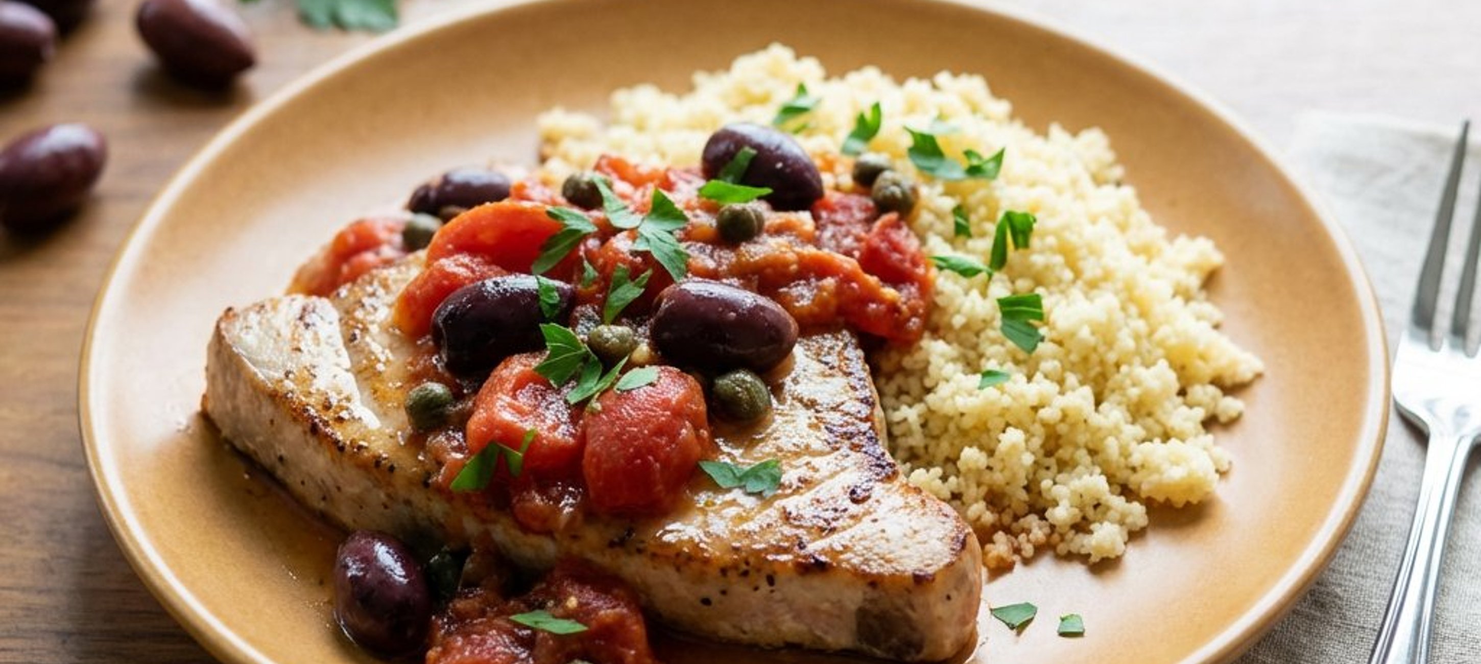 Schwertfisch ist ein fester, fleischiger Fisch, der beim Braten seine Form behält. Achten Sie darauf, ihn nicht zu übergaren – er schmeckt am besten, wenn er innen noch leicht saftig ist. Ein Spritzer frischer Zitronensaft vor dem Servieren hebt die medit