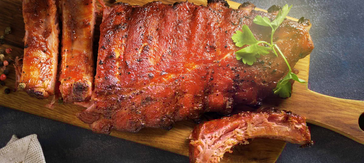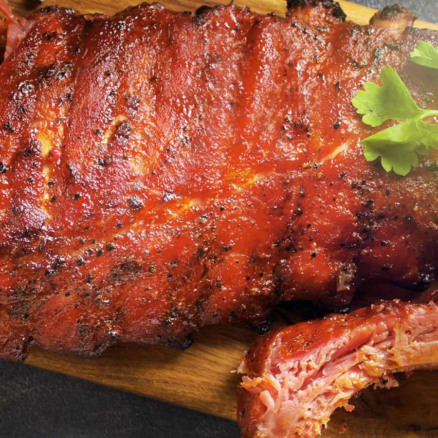 - 4Nun die übrigen Räucherchips hinzugeben und die Spareribs weitere 1 bis 1,5 Stunden durchgaren lassen. Die Rippchen jeweils alle 30 Minuten im Spareribs-Halter um eine Position versetzen. Erst in den letzten 30 Minuten wenden und mit der Fleischseite nach hinten im Halter garen.