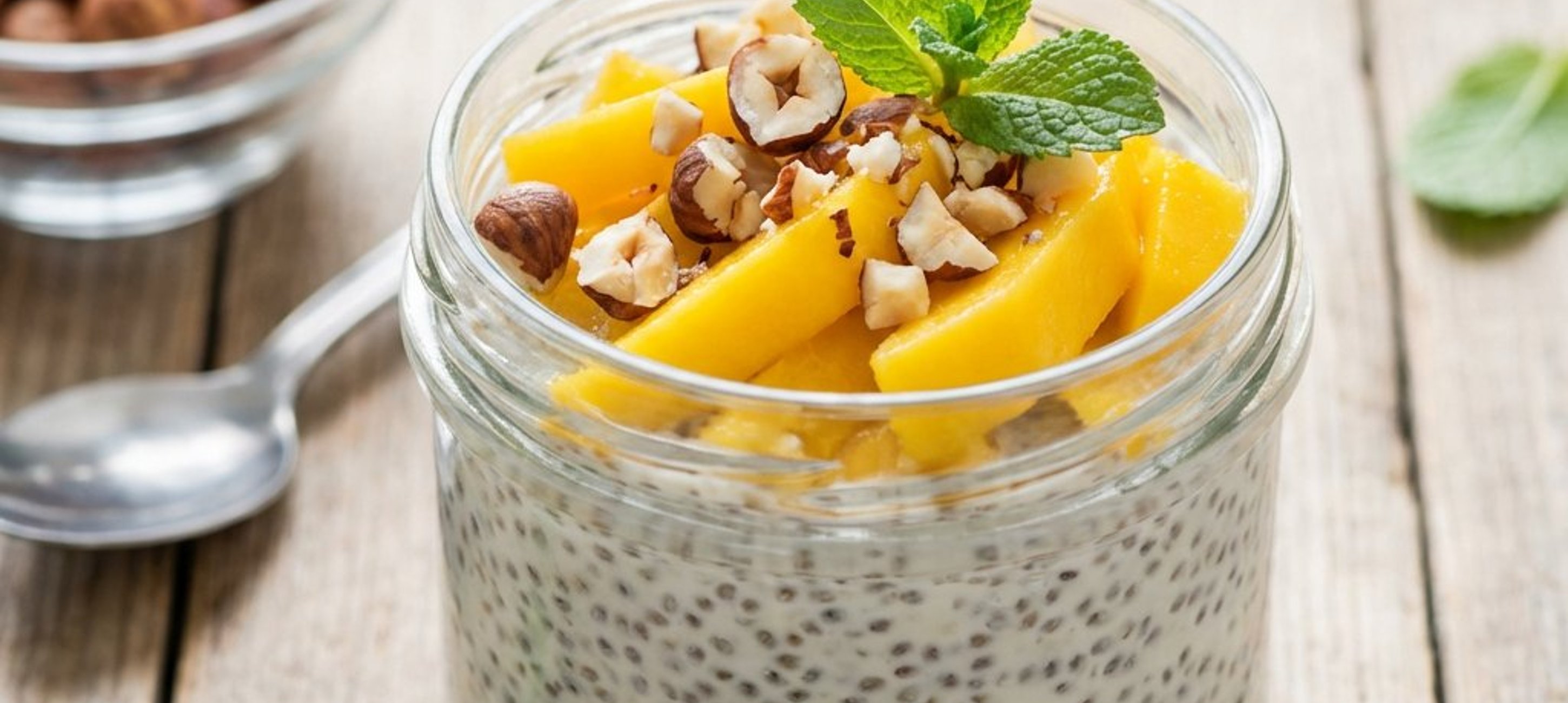 - 3Die Joghurtmischung in Gläser füllen, die Mangostücke (oder das Püree) darauf anrichten und mit frischen Minzblättern sowie gehackten Haselnüssen garnieren.