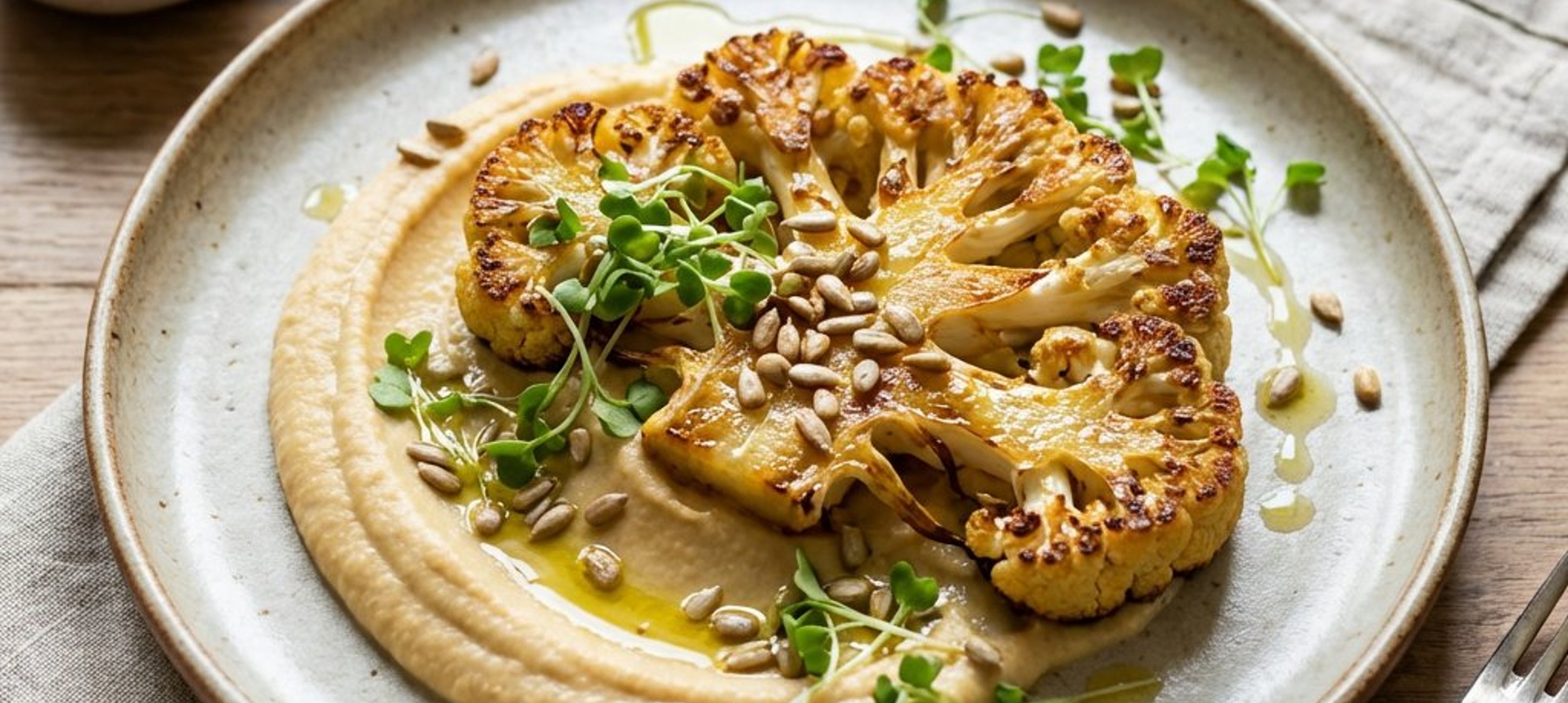 - 2Die Kichererbsencreme auf Tellern verstreichen. Das Blumenkohl-Steak darauf anrichten und mit frischen Sprossen, Sonnenblumenkernen und einem Spritzer Chiliöl verfeinern.