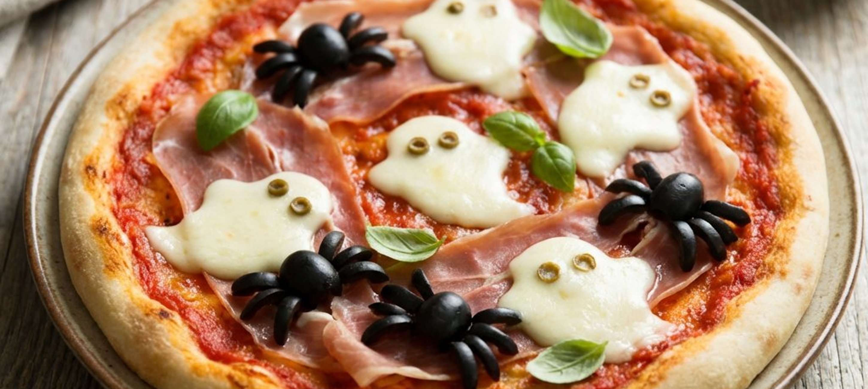 - 4Die Pizza mit Prosciutto belegen. Den Mozzarella in Scheiben schneiden und mit einem Messer oder einer Form kleine Geisterfiguren ausschneiden. Die Mozzarella-Geister auf der Pizza verteilen. Aus den schwarzen Oliven kleine Spinnen basteln (eine halbe Olive als Körper, Streifen als Beine) und Gesichter für die Geister legen.