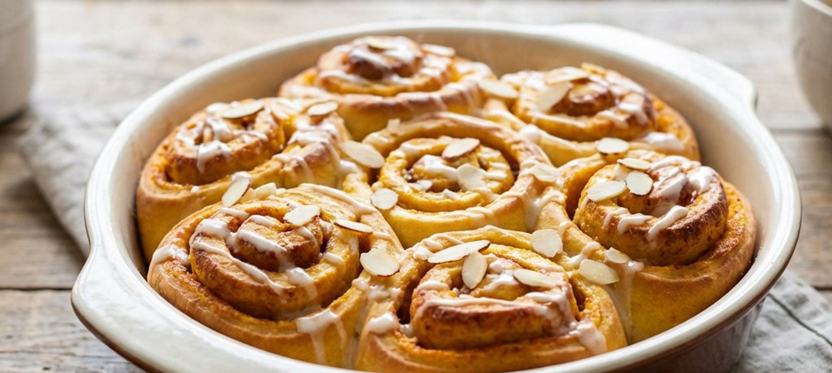 - 1In der Zwischenzeit die Füllung vorbereiten. Das Kürbispüree mit den restlichen 60 g weicher Butter, dem braunen Rohrzucker und dem Pumpkin Spice Gewürz glatt rühren. Sobald der Teig aufgegangen ist, auf einer bemehlten Arbeitsfläche zu einem großen Rechteck ausrollen. Die gesamte Oberfläche mit der Kürbisfüllung bestreichen und mit den Mandelblättchen bestreuen. Den Teig von der langen Seite her fest aufrollen und in gleichmäßige Schnecken schneiden.
