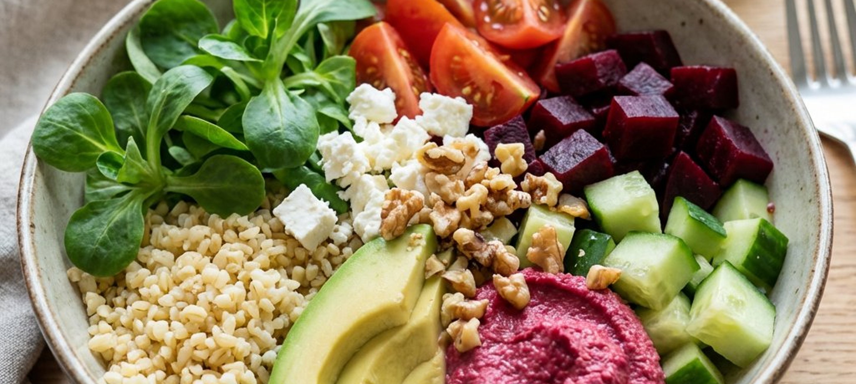 - 4Den Bulgur in Schüsseln verteilen und den Feldsalat darauf anrichten. Die vorbereiteten Gemüsewürfel und Tomaten dazugeben. Den Feta-Käse darüber bröseln und einen großzügigen Klecks Rote-Bete-Hummus hinzufügen. Die Walnusskerne grob hacken und den Salat damit garnieren. Guten Appetit!