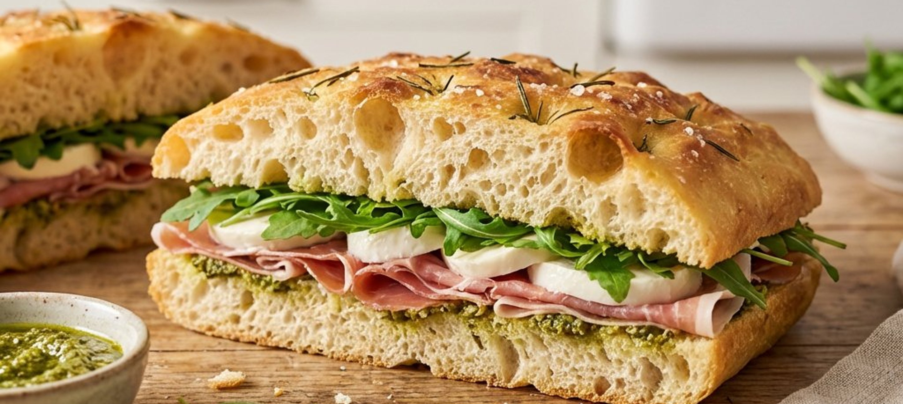 - 1Die abgekühlte Focaccia in Stücke schneiden und diese waagerecht halbieren. Beide Hälften großzügig mit Pesto bestreichen. Die untere Hälfte mit einer Handvoll Rucola, Prosciutto-Scheiben, in Scheiben geschnittenem Mozzarella und frischen Basilikumblättern belegen. Mit der zweiten Hälfte abdecken. Für ein einfacheres Servieren das Sandwich in Backpapier einwickeln, in der Mitte durchschneiden und sofort genießen.