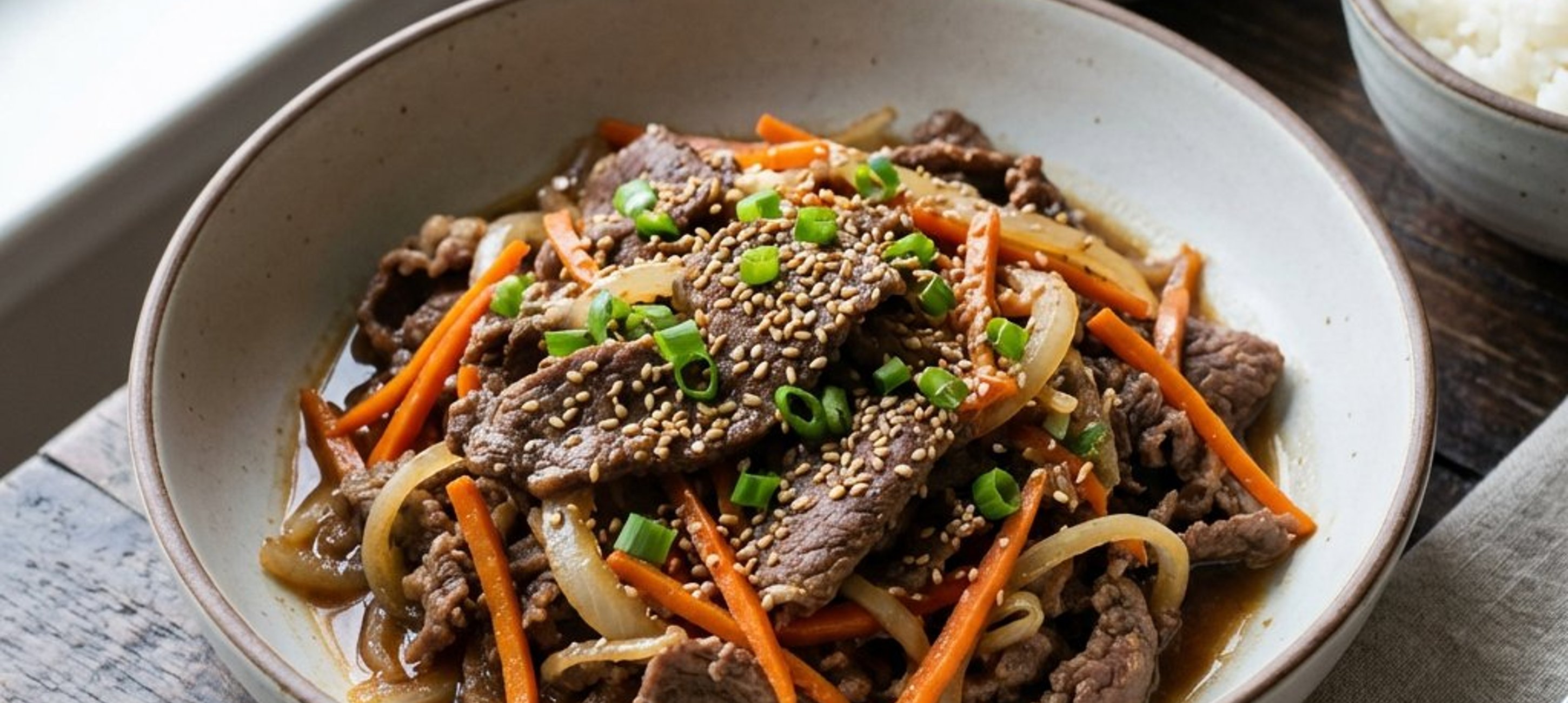 - 5Sobald die Sauce eindickt, das Fleisch, das gebratene Gemüse und die geschnittenen Frühlingszwiebeln wieder hinzufügen. Mit Salz und Pfeffer abschmecken und nicht mehr kochen. Mit gekochtem Reis und Kimchi servieren und mit Sesamsamen bestreuen.