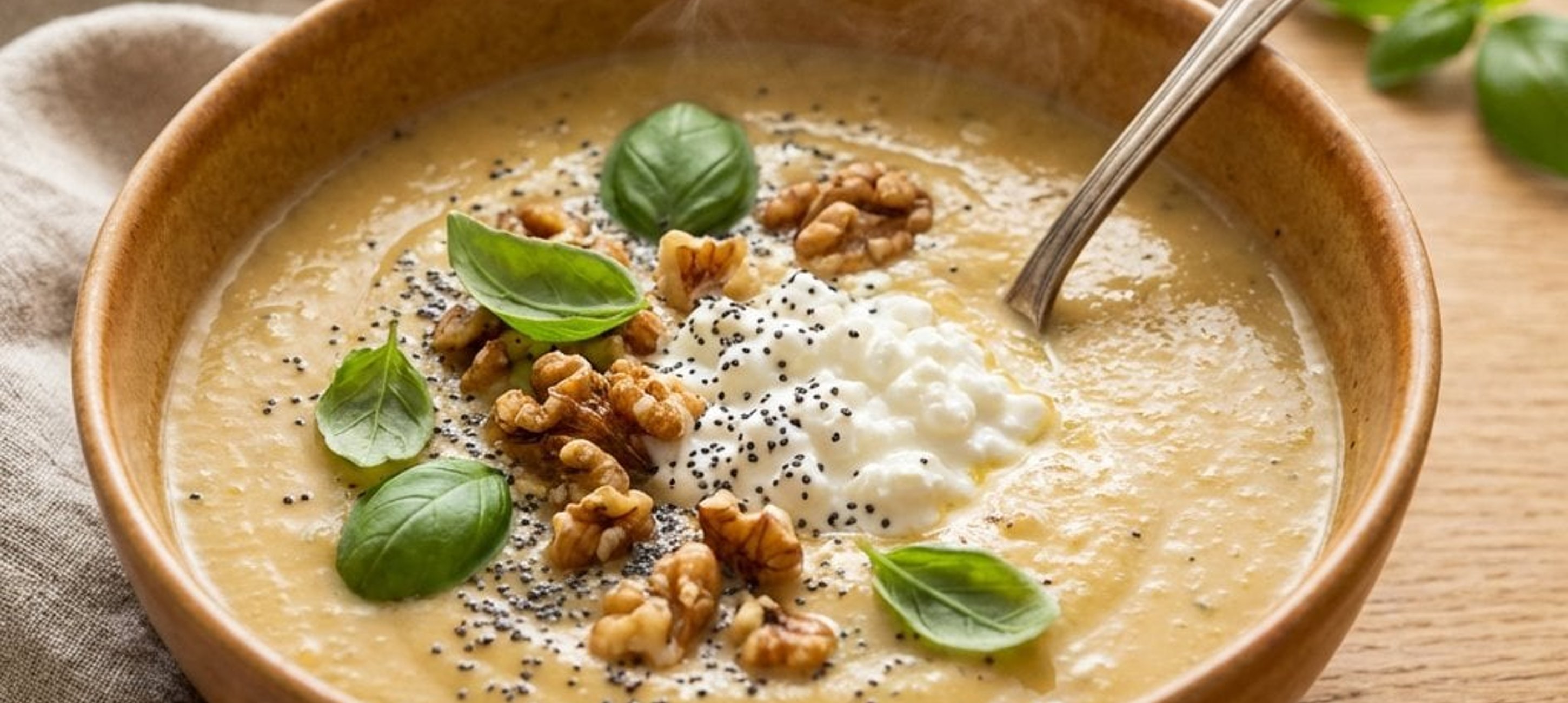 - 2Das geröstete Gemüse in einen Standmixer geben. Die Gemüsebrühe und den Hüttenkäse hinzufügen und alles zu einer glatten Creme mixer. Mit Salz und Pfeffer abschmecken. Die Suppe in Schalen anrichten, mit dem Nuss-Mohn-Topping bestreuen und mit frischem Basilikum garniert servieren.