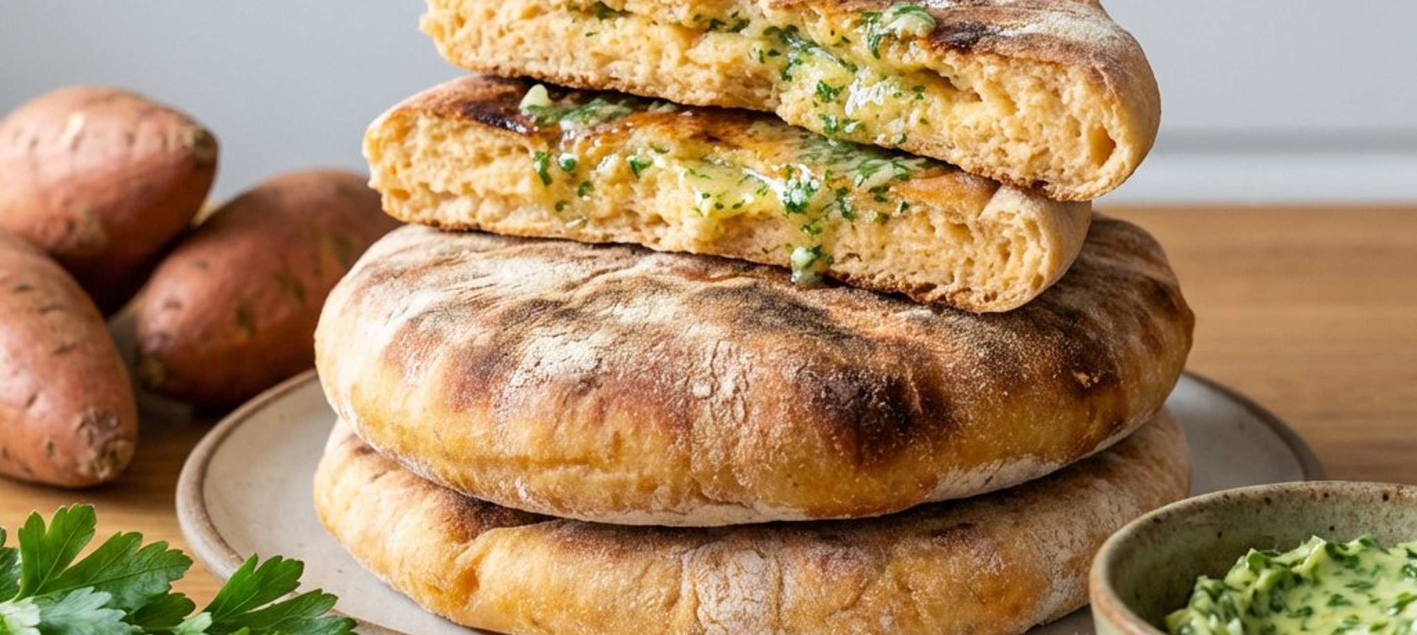 Servieren Sie das Brot am besten direkt aus der Pfanne, solange es noch dampfend heiß ist. Die Knoblauchbutter zieht dann perfekt in die Poren des weichen Süßkartoffelteigs ein. Ein Glas kühler Weißwein passt hervorragend dazu!