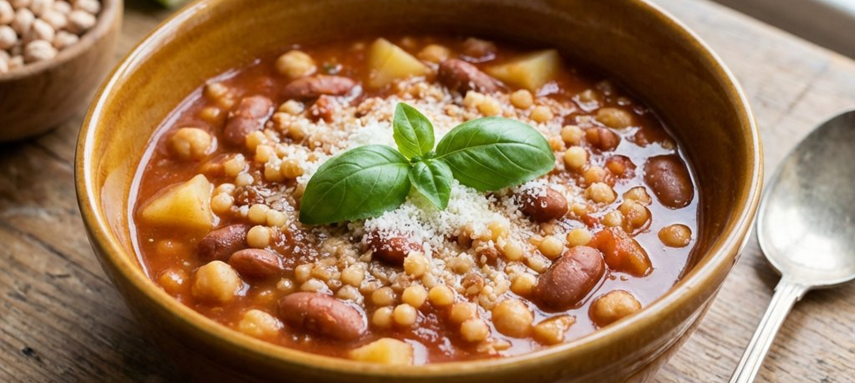 - 3Alles mit ca. 1,5–2 Litern Wasser aufgießen, sodass das Gemüse etwa 2–3 cm unter der Wasseroberfläche liegt. Zum Kochen bringen, dann die Hitze reduzieren und bei offenem Deckel etwa 1,5 Stunden köcheln lassen, bis die Bohnen weich sind. Bei Bedarf zwischendurch Wasser nachgießen. Die Fregola Sarda (oder Couscous) einrühren, mit Salz und Pfeffer abschmecken und weitere 10 Minuten garen, bis die Pasta weich ist.