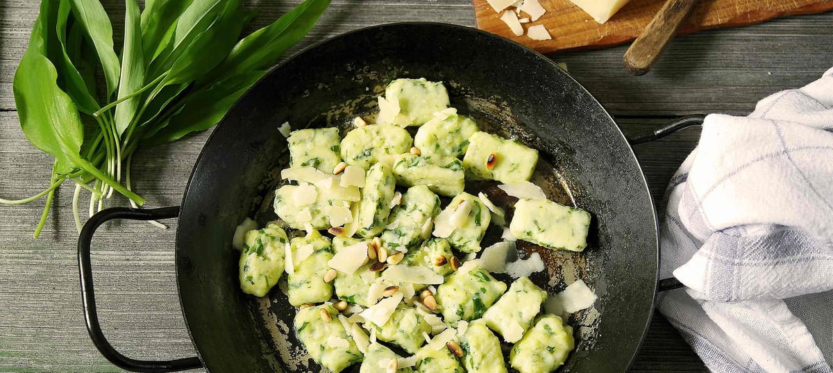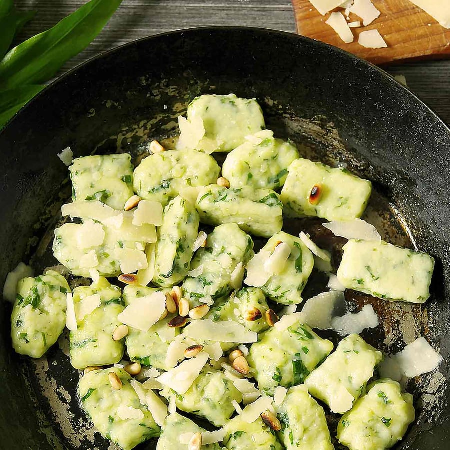 - 3Die Kartoffeln aus dem Wasser nehmen und kurz abkühlen lassen. Dann schälen und pressen. Das Bärlauchpüree mit Salz, Pfeffer und Muskat abschmecken. Mehl und Grieß hinzufügen. Alles vermengen und zu einem Teig verkneten.