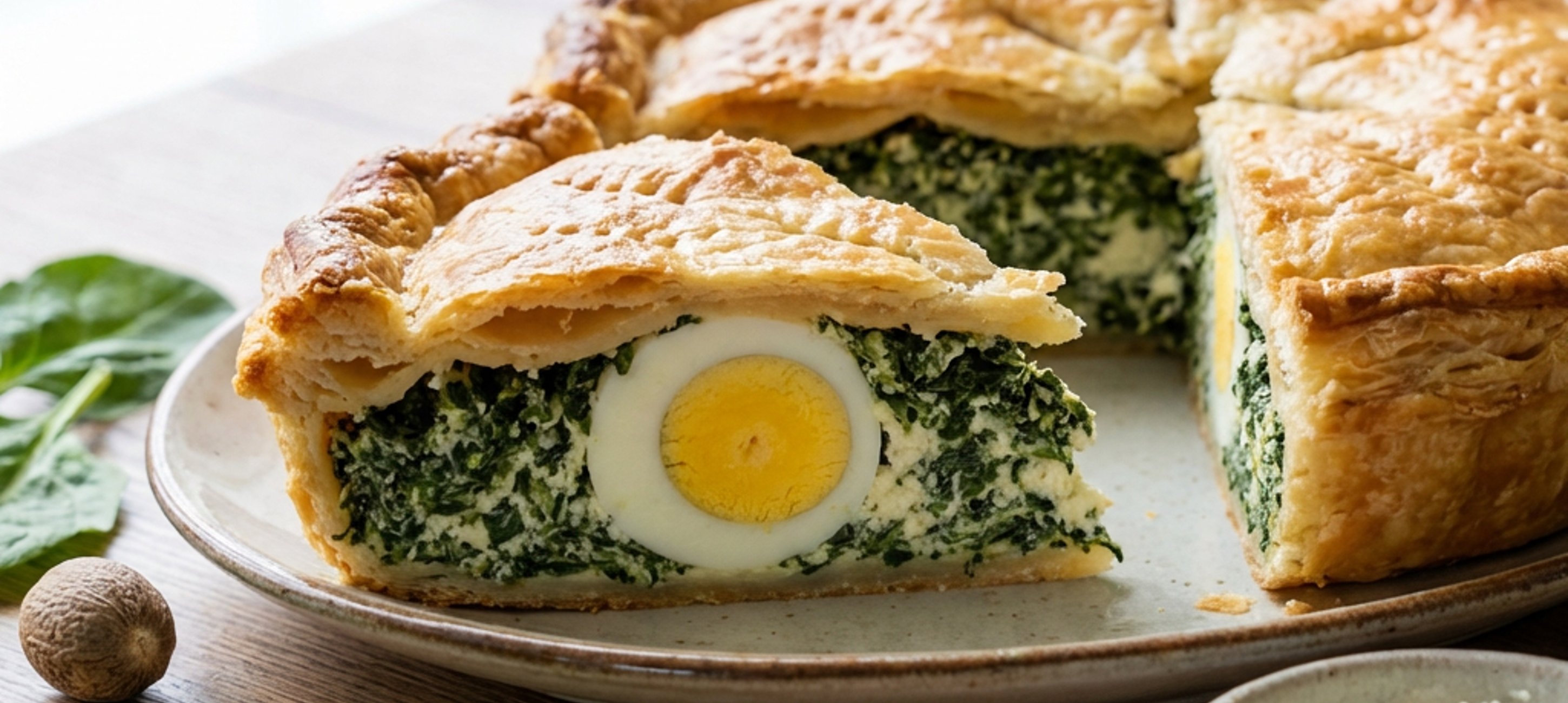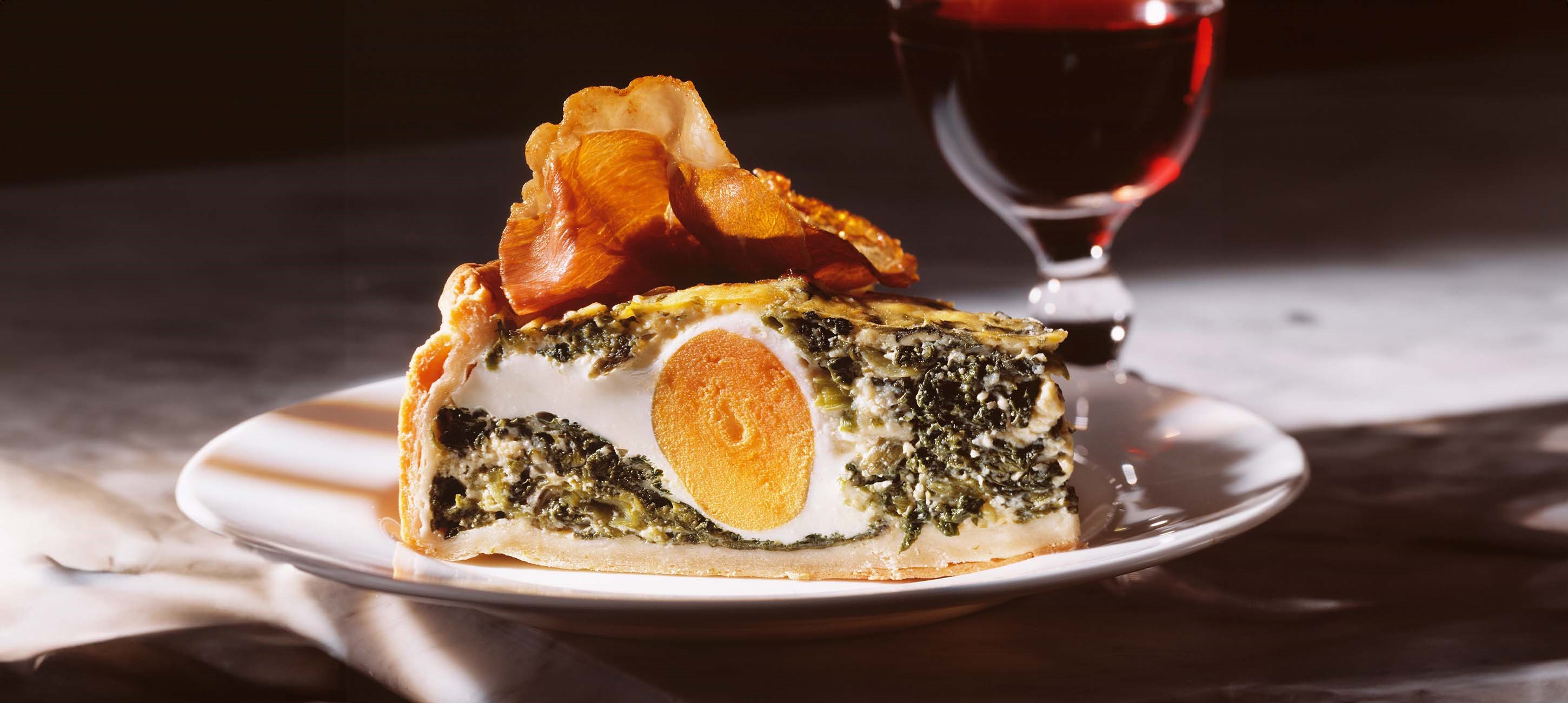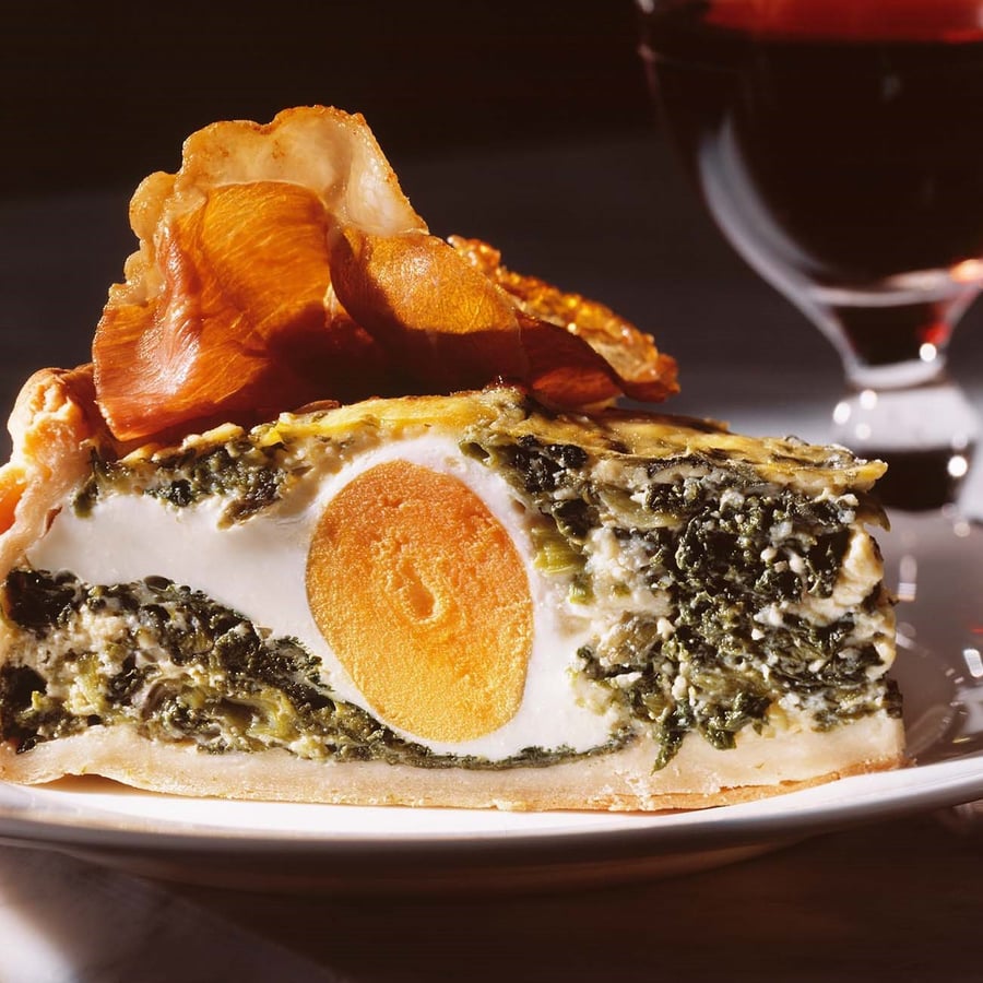 - 26 Eier hart kochen, abschrecken und abkühlen lassen. Anschließend die Eier pellen. Den Backofen auf 180°C Umluft vorheizen. Ein Stück des Blätterteigs, das ein bisschen größer ist als die Springform, in die gebutterte Form geben (er sollte über den Rand hinausstehen). Die Füllung in die Form geben.