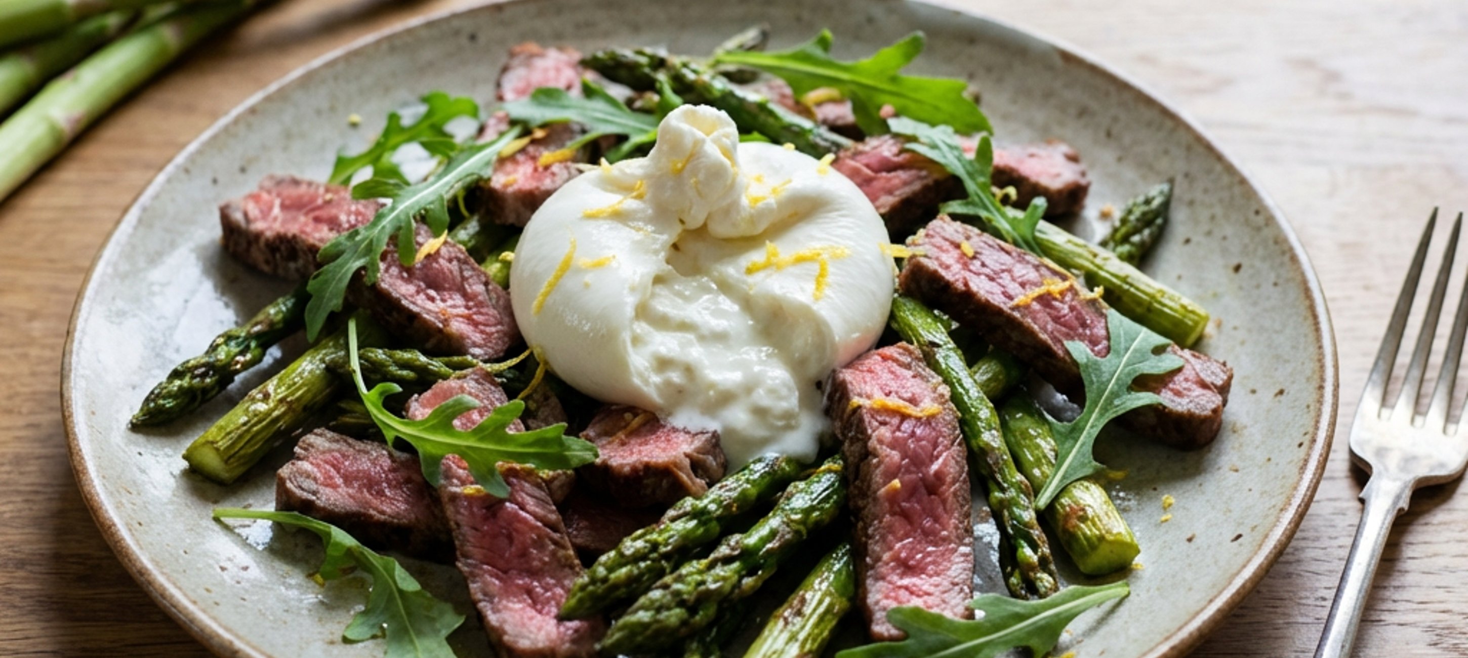 - 8Zum Schluss den Burrata zerrupfen und mit dem Rucola über dem Steak und dem Spargel verteilen. Mit Zitronenabrieb, Olivenöl, Salz und Pfeffer würzen und noch warm servieren. Guten Appetit!