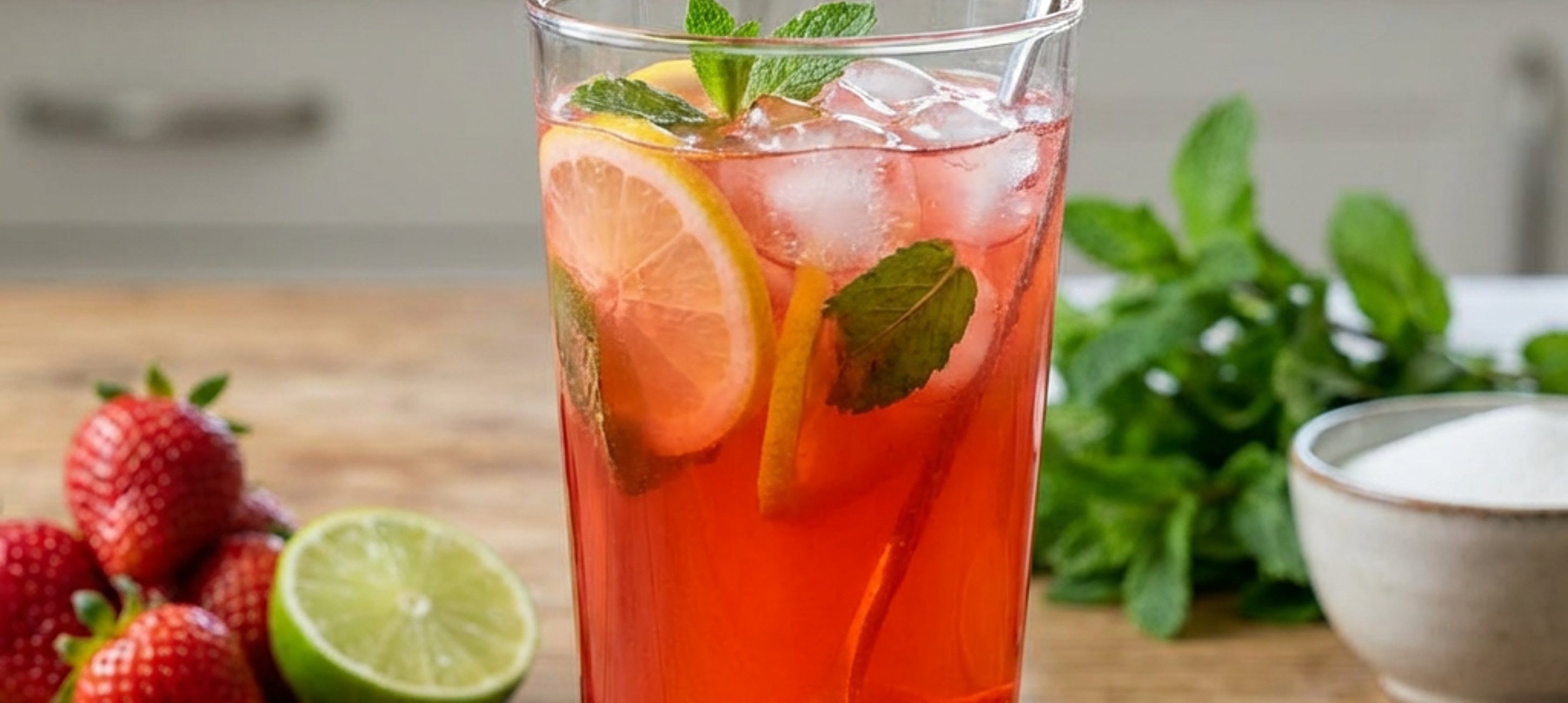 - 2Den Erdbeersaft in eine Karaffe geben, Limettensaft, Zitronenscheiben, Eiswürfel und Minzblätter hinzugeben und alles mit einem Esslöffel vermischen. Mit Mineralwasser auffüllen und sofort servieren oder in eine Flasche mit 750ml Fassungsvermögen abfüllen und bis zum Servieren kühlstellen.