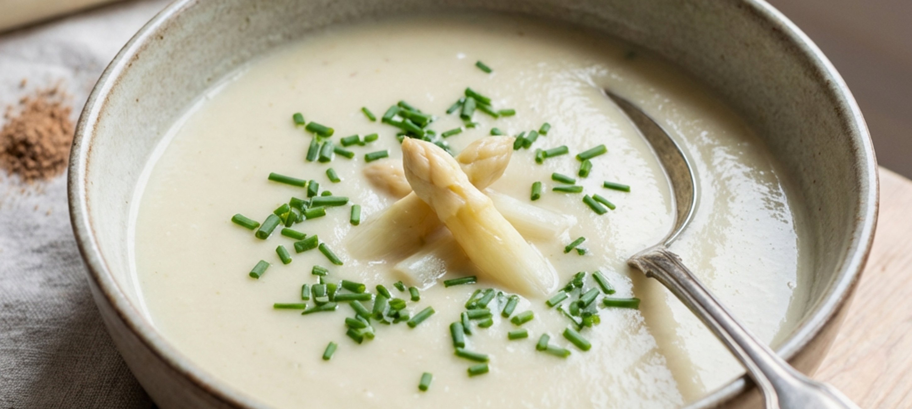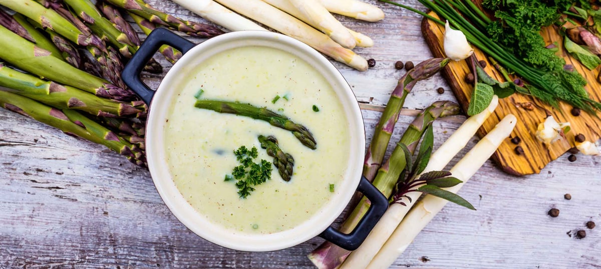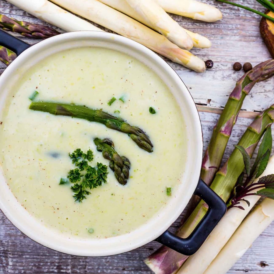 - 4Etwas Spargelwasser zugeben und unter ständigem Rühren aufkochen. Nach und nach das restliche Spargelwasser einrühren. Wenn die Suppe eine cremige Konsistenz hat, die Spargelstückchen unterheben und die Suppe pürieren.