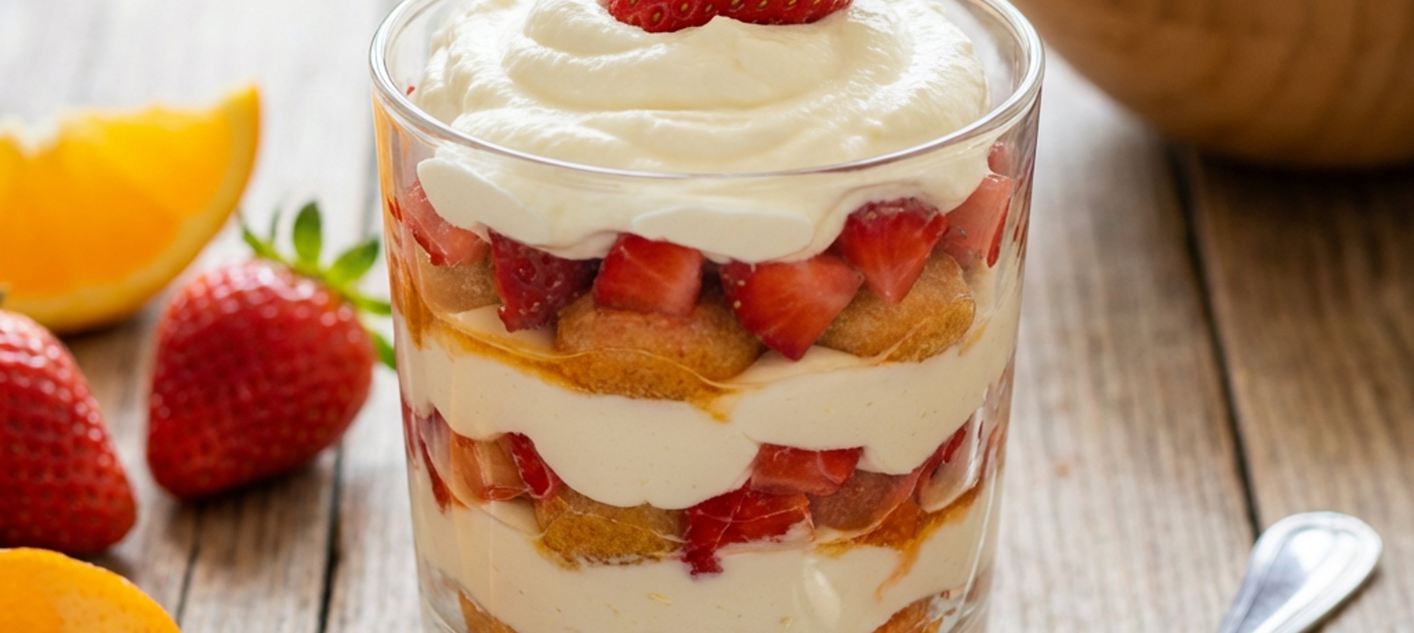 - 3Den Löffelbiskuit grob zerkleinern. Den Boden von vier Dessertgläsern (à 250 ml) damit bedecken. Den Löffelbiskuit jeweils mit etwas Orangensaft beträufeln, dann ca. 2 EL frische Erdbeeren auf die Löffelbiskuits geben gefolgt von ca. 3 EL Creme.