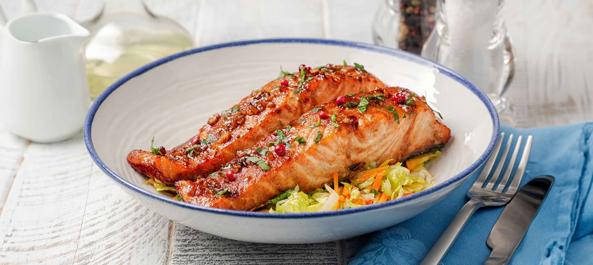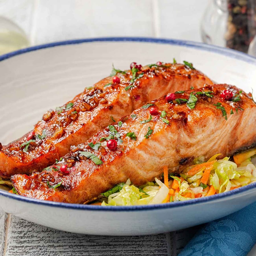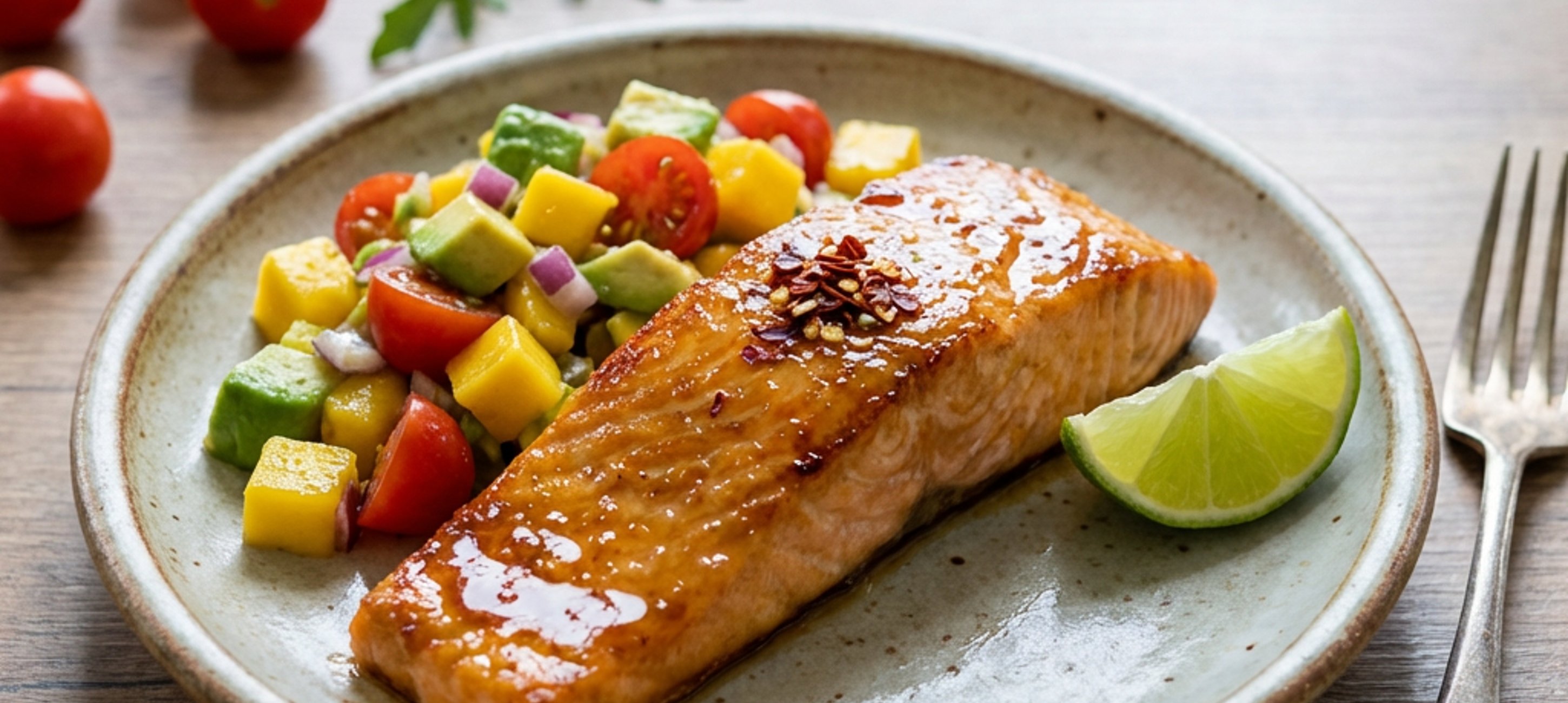 - 4Den Lachs mit der Avocado-Mango-Salsa anrichten. Dazu schmeckt Baguette.
