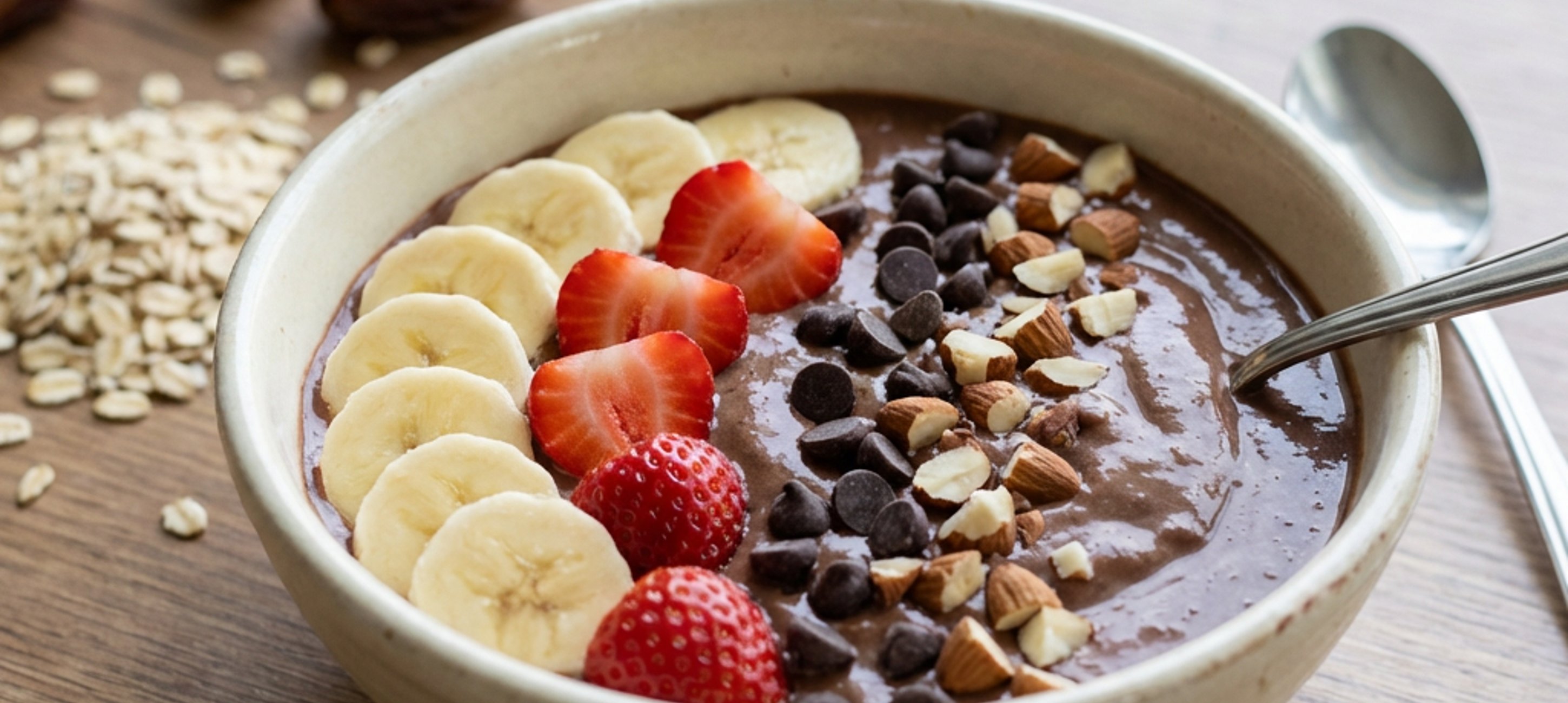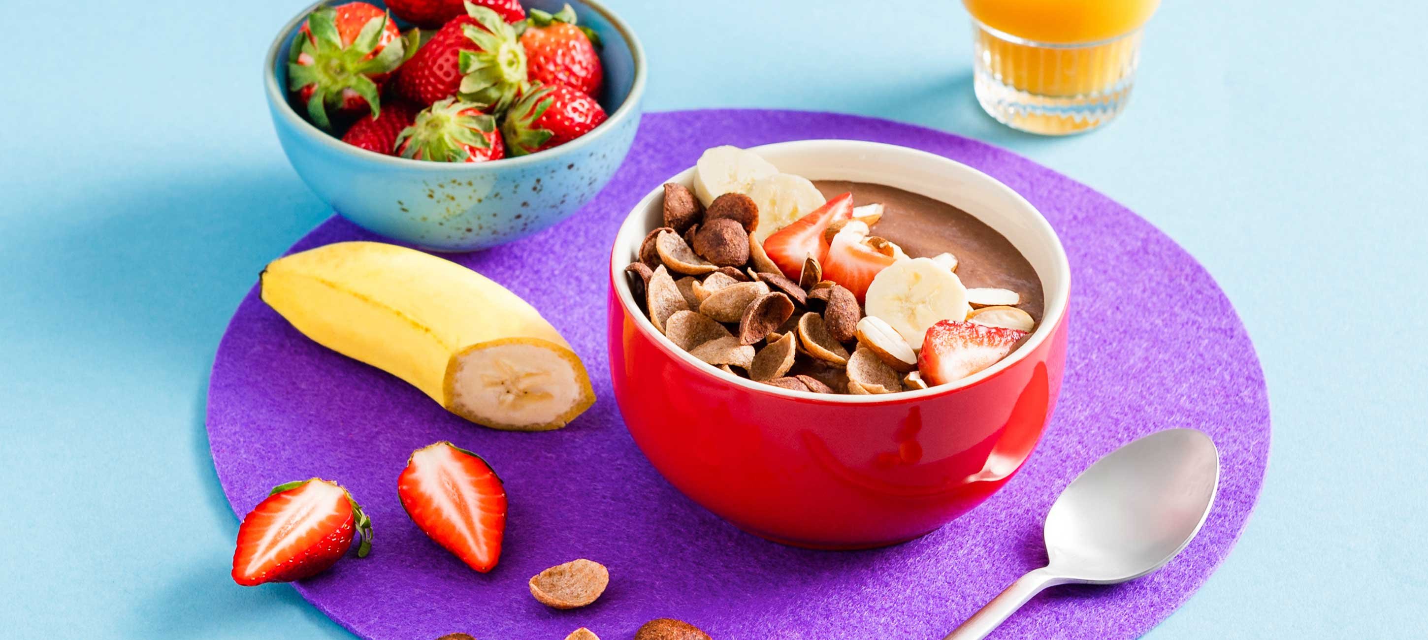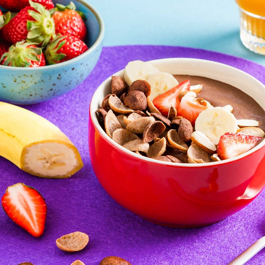 - 2Fülle die Mischung in eine Schüssel und toppe den Mix mit Bobs Schoko Chips von Freche Freunde Kids, Bananenscheiben, Erdbeeren und Mandeln.