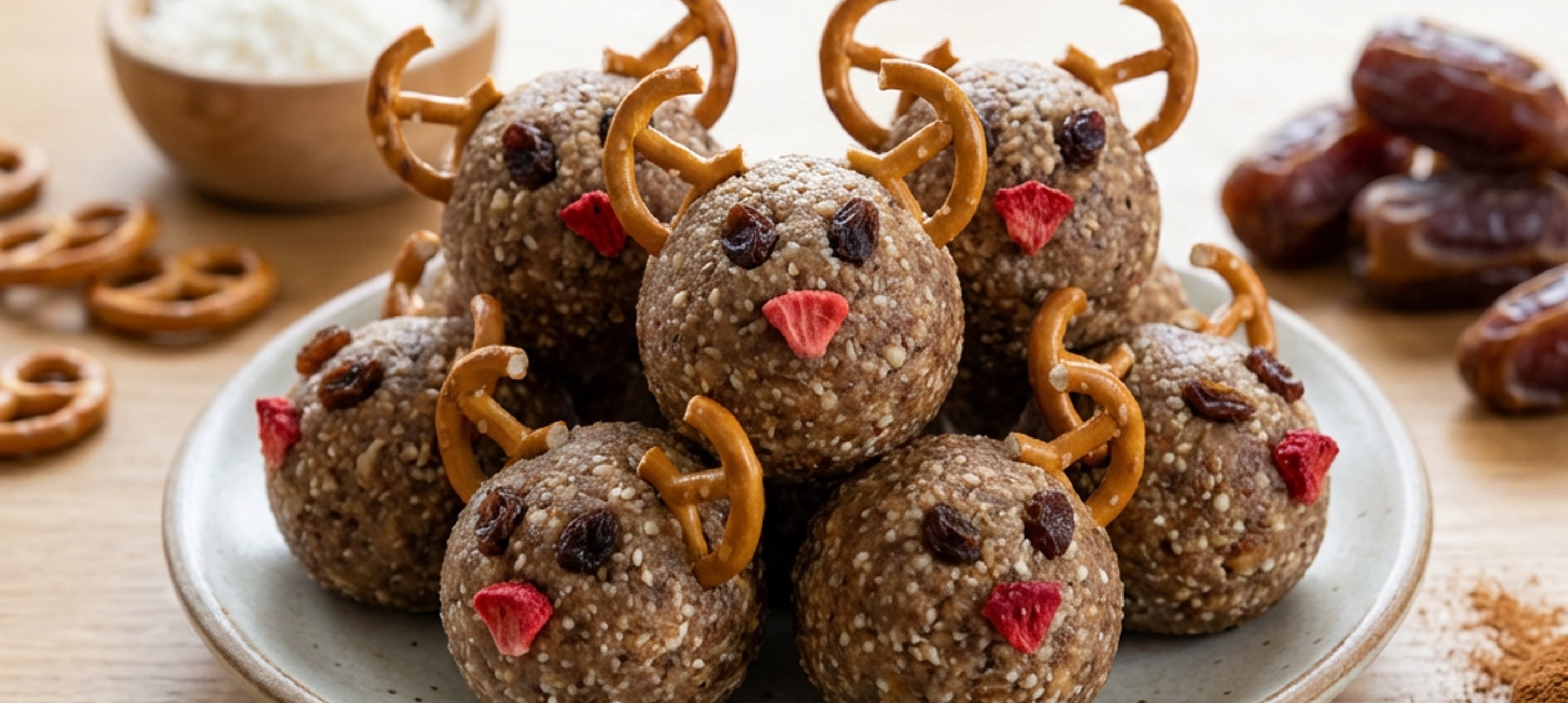 - 3Halbiere die Freche Freunde Bio Bretzeln in der Mitte und stecke sie als Hirschhörner in die Bällchen. Halbiere die Freche Freunde Bio Rosinchen und stecke sie als Augen drauf. Stecke zum Schluss ein Stück Freche Freunde Bio Erdbeer Fruchtchip als Nase ein.