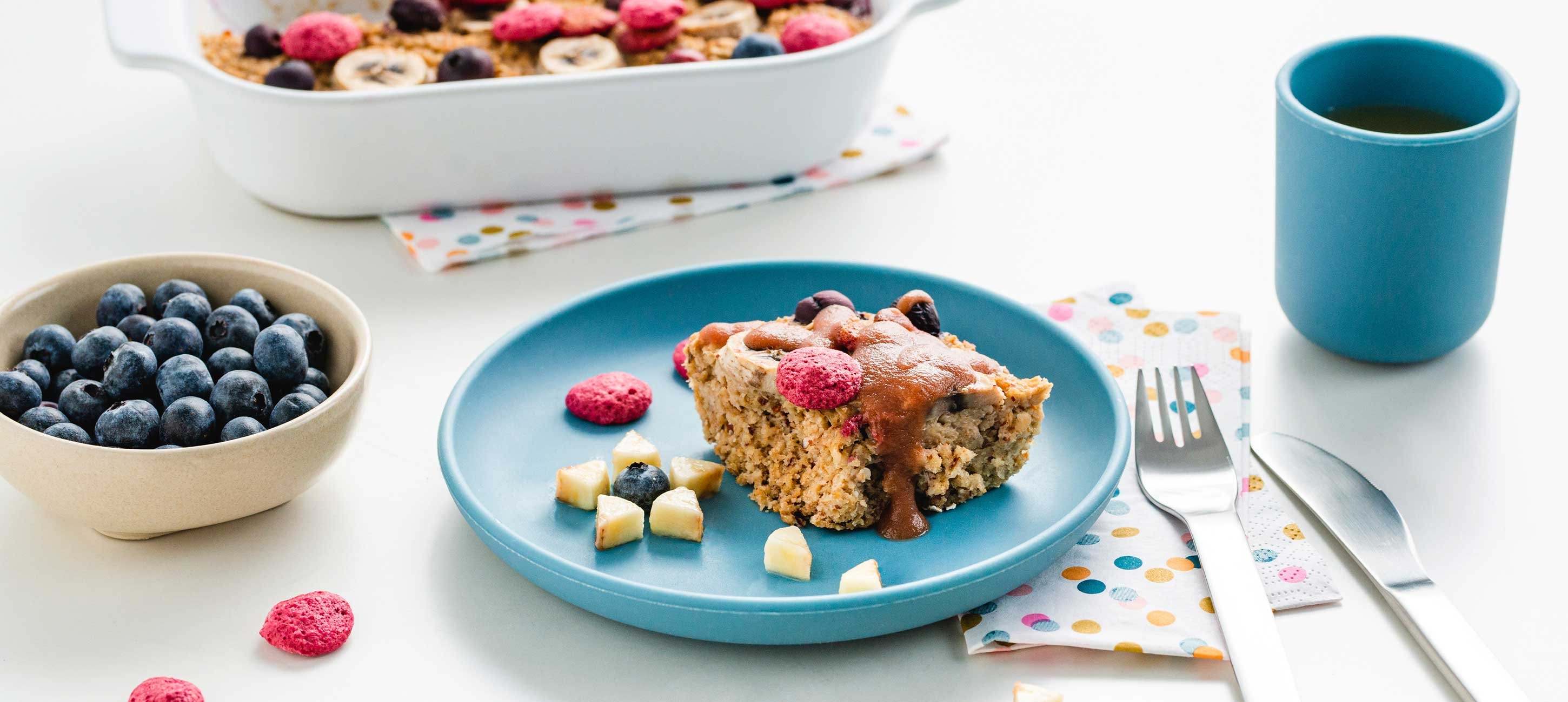 - 6Das Oatmeal backt nun auf der mittleren Einschubleiste etwa 20 - 30 Minuten (je nach Größe Deiner Auflaufform und Höhe der Masse).