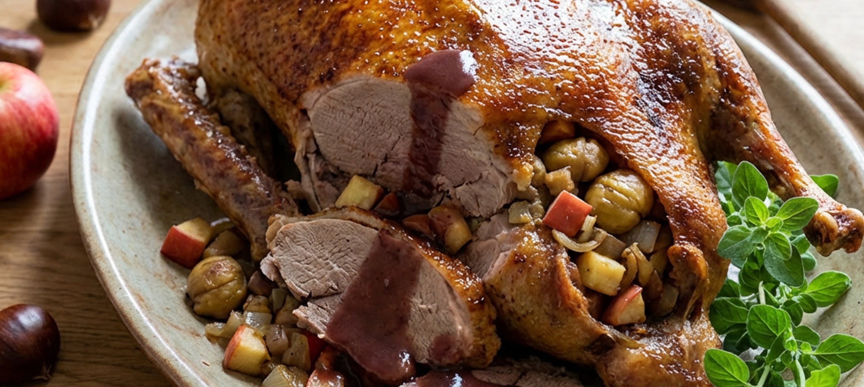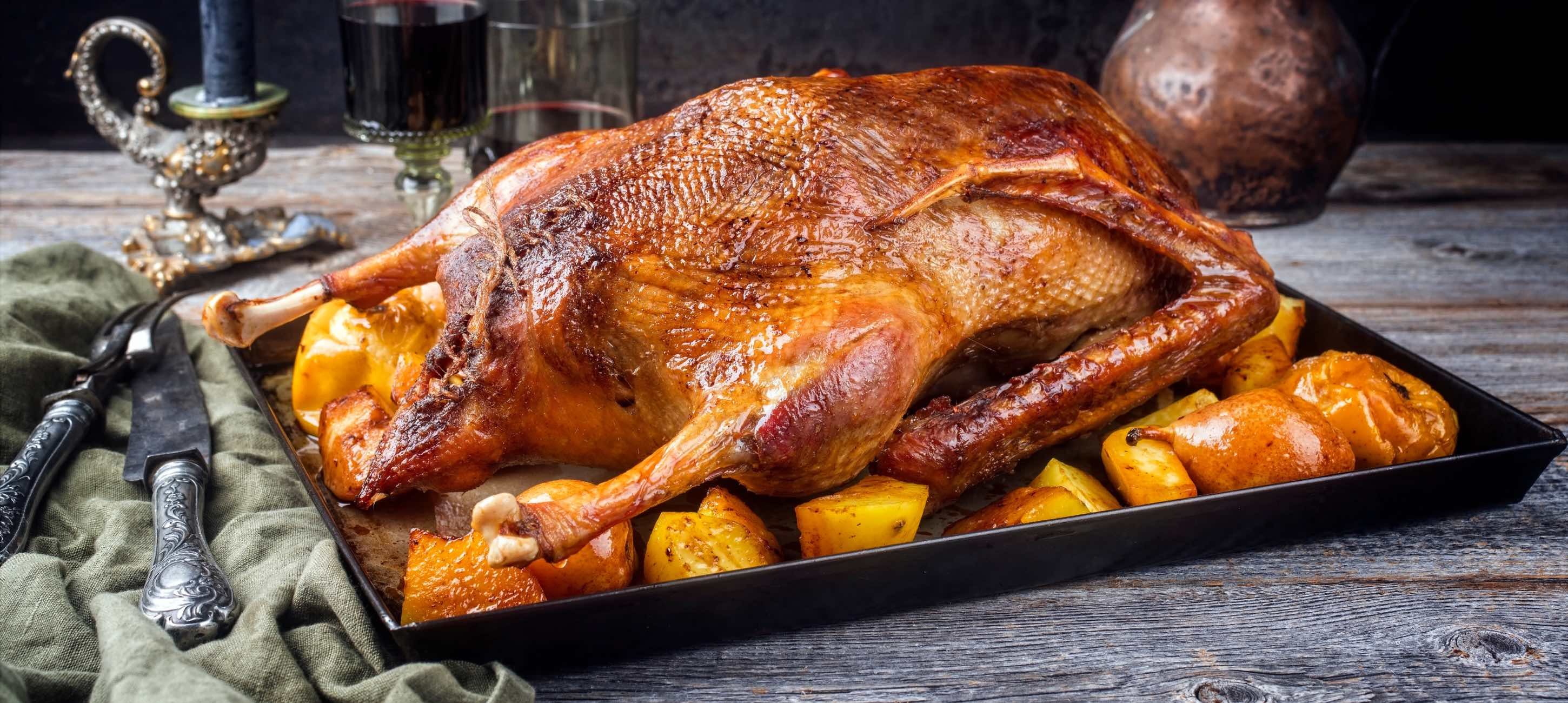 - 6Die Gans auf einer Platte anrichten und gemeinsam mit dem Fond servieren.