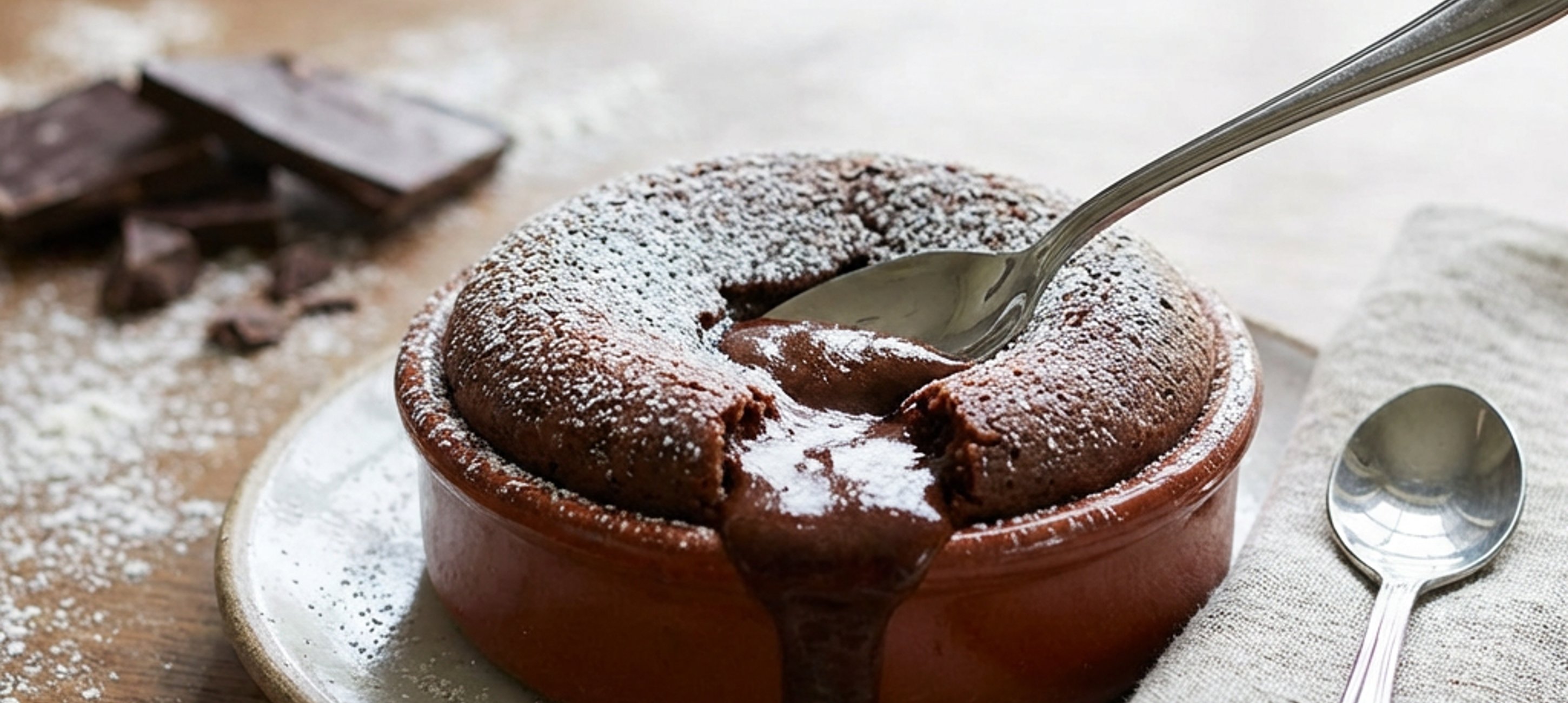 - 1Den Backofen auf 180°C Ober-/Unterhitze oder 155°C Umluft vorheizen. 6 kleine Souffléförmchen einfetten und mit Zucker bestreuen. Den Teig in die Förmchen füllen und auf der mittleren Schiene für 9-12min backen.