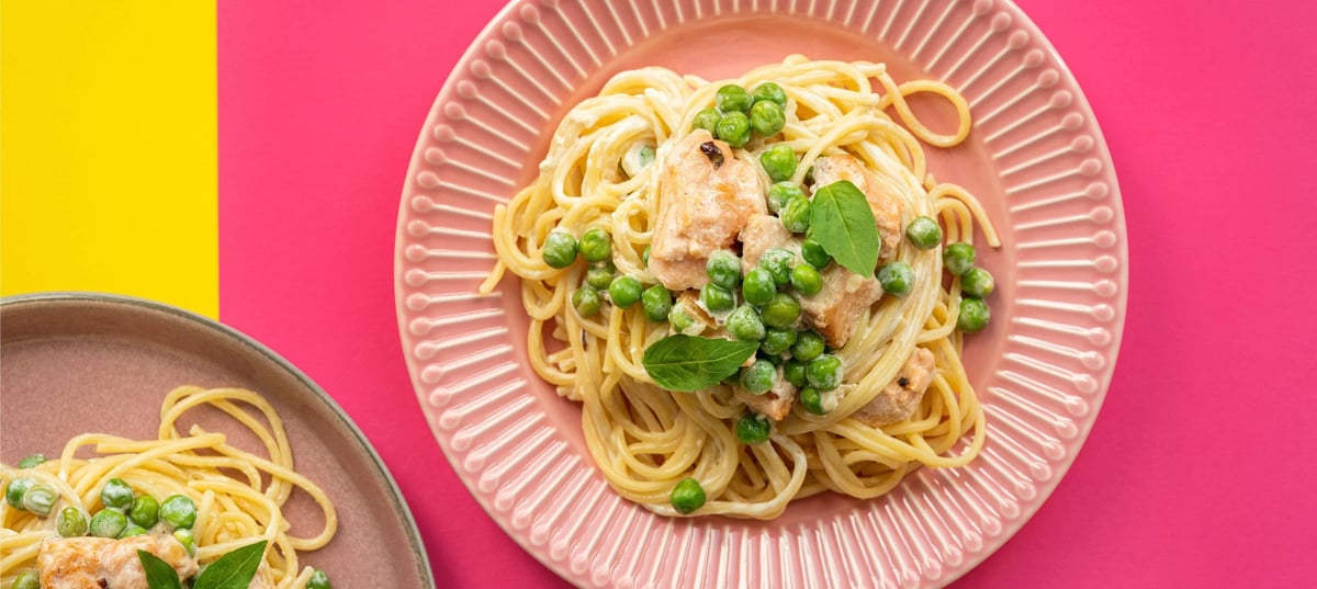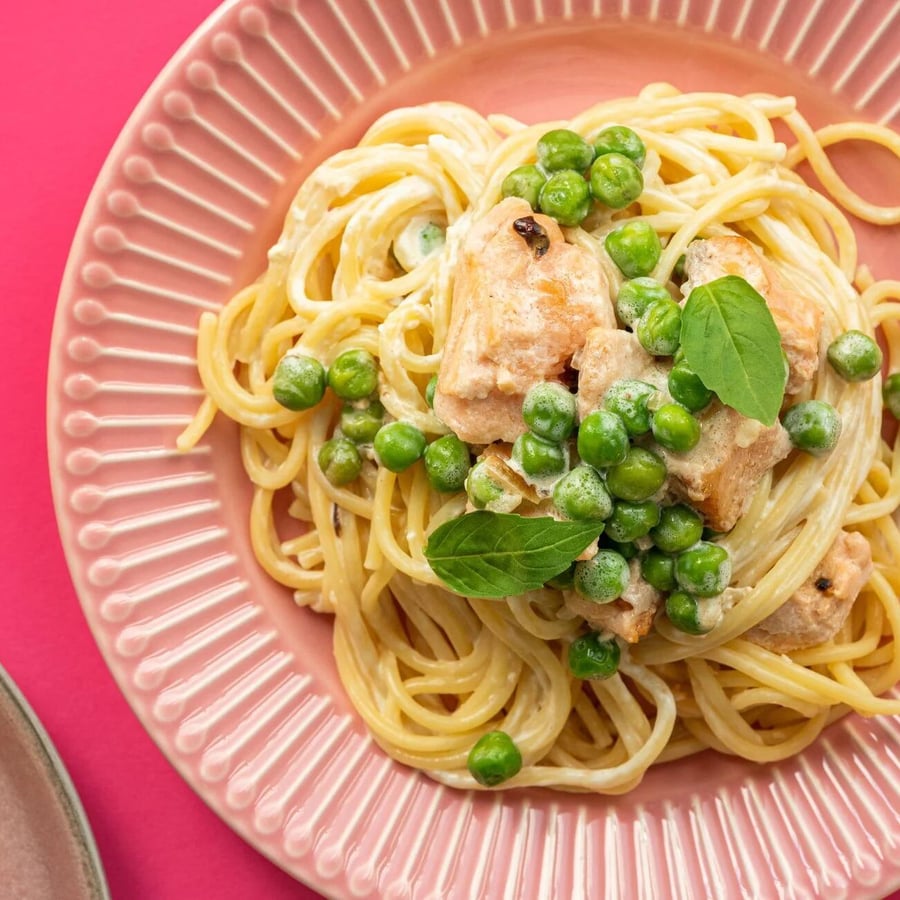 - 4Nach dem Anbraten Wasser und Sahne dazugeben, den Frischkäse einrühren und die Sauce 4–5 Minuten köcheln lassen, bis sie eindickt. Zum Schluss die Erbsen, Petersilie und die gekochte Pasta in die Pfanne geben, alles gut vermengen, die Hitze ausschalten und servieren.