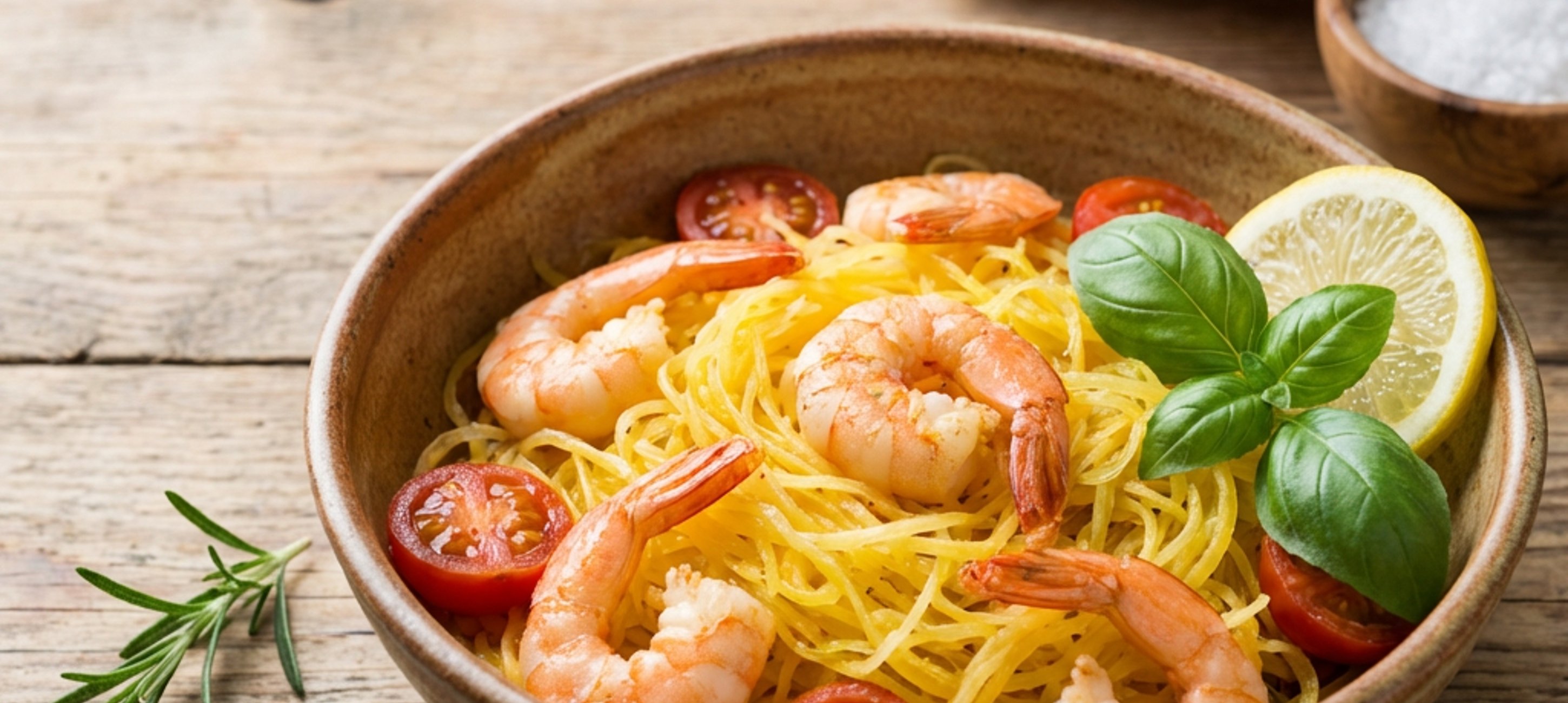 - 2Die gewaschenen Kirschtomaten halbieren, Knoblauch zerdrücken. Olivenöl in einer heißen Pfanne erhitzen, Knoblauch und Garnelen (geputzt, entdarmt) kurz anbraten, dann Tomaten, Salz und Pfeffer hinzufügen. Weitere 2 Minuten sautieren, schließlich den Spaghettikürbis untermischen und abschmecken.