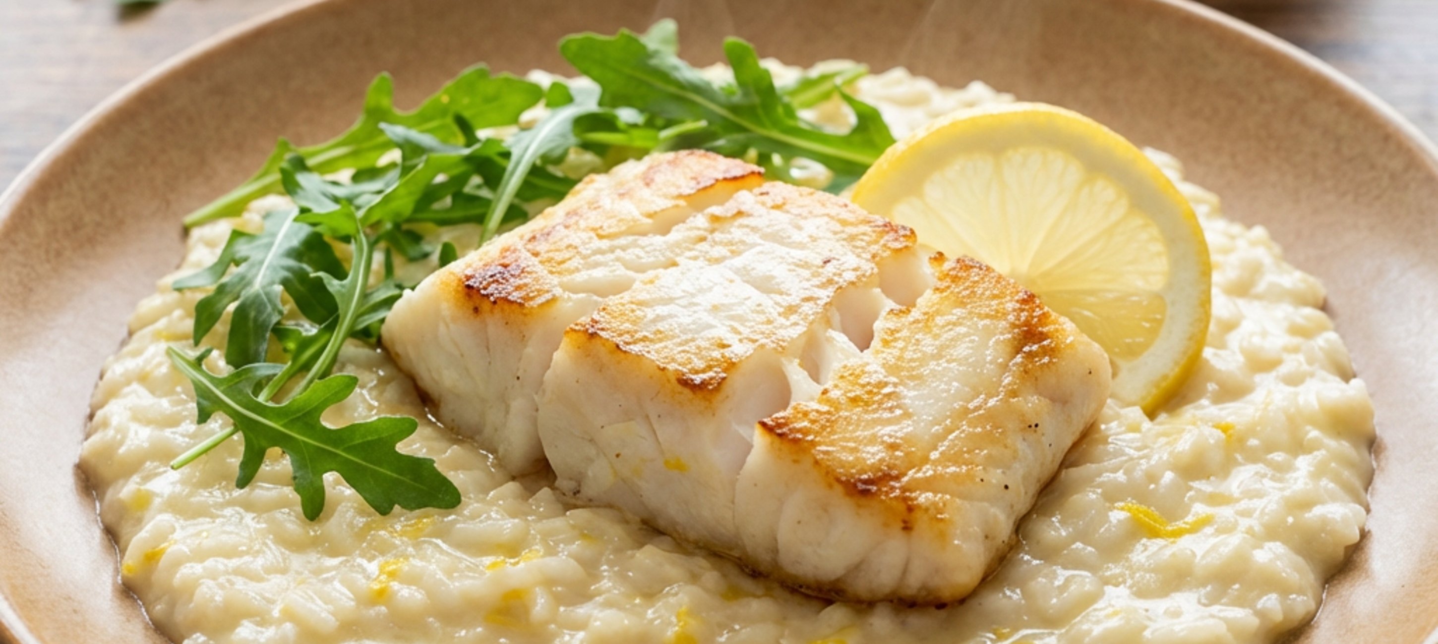- 5Risotto mit Rucola toppen und Fisch darauf anrichten.
