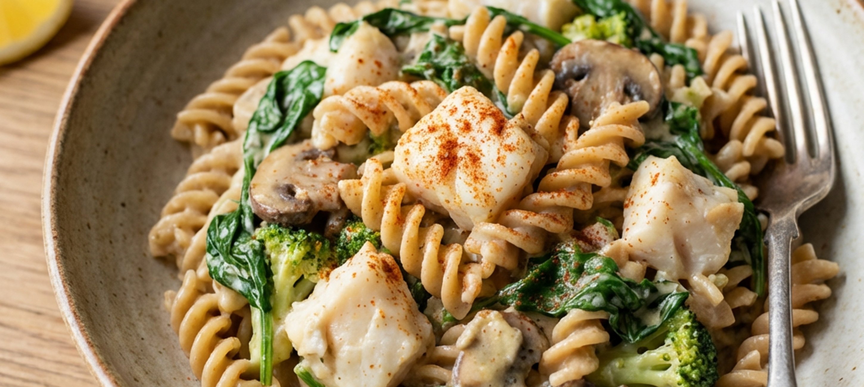 - 3Die Nudeln und Spinat dazugeben und unterrühren. Abgedeckt bei kleiner bis mittlerer Hitze ca. 12 Min. sanft köcheln lassen, dann den Fisch dazugeben und weitergaren bis die Nudeln gar sind. Gelegentlich umrühren. Alles mit Muskatnuss und Paprikapulver würzen.