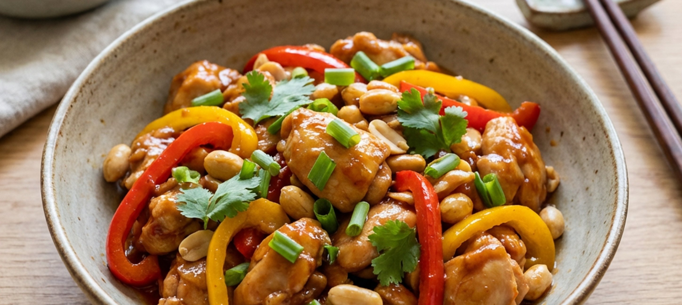 - 3Das fertige Kung Pao mit Salz und Pfeffer abschmecken, in 4 Portionen aufteilen, jede Portion mit Erdnüssen bestreuen und servieren.