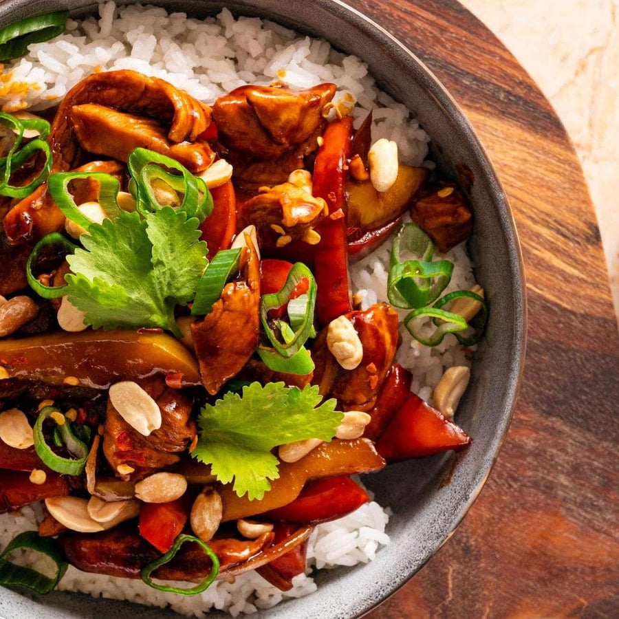 - 4Kung Pao am besten mit Reis servieren. Zusätzlich zu den Erdnüssen können einzelne Portionen auch mit frischem Koriander und extra Frühlingszwiebeln garniert werden.