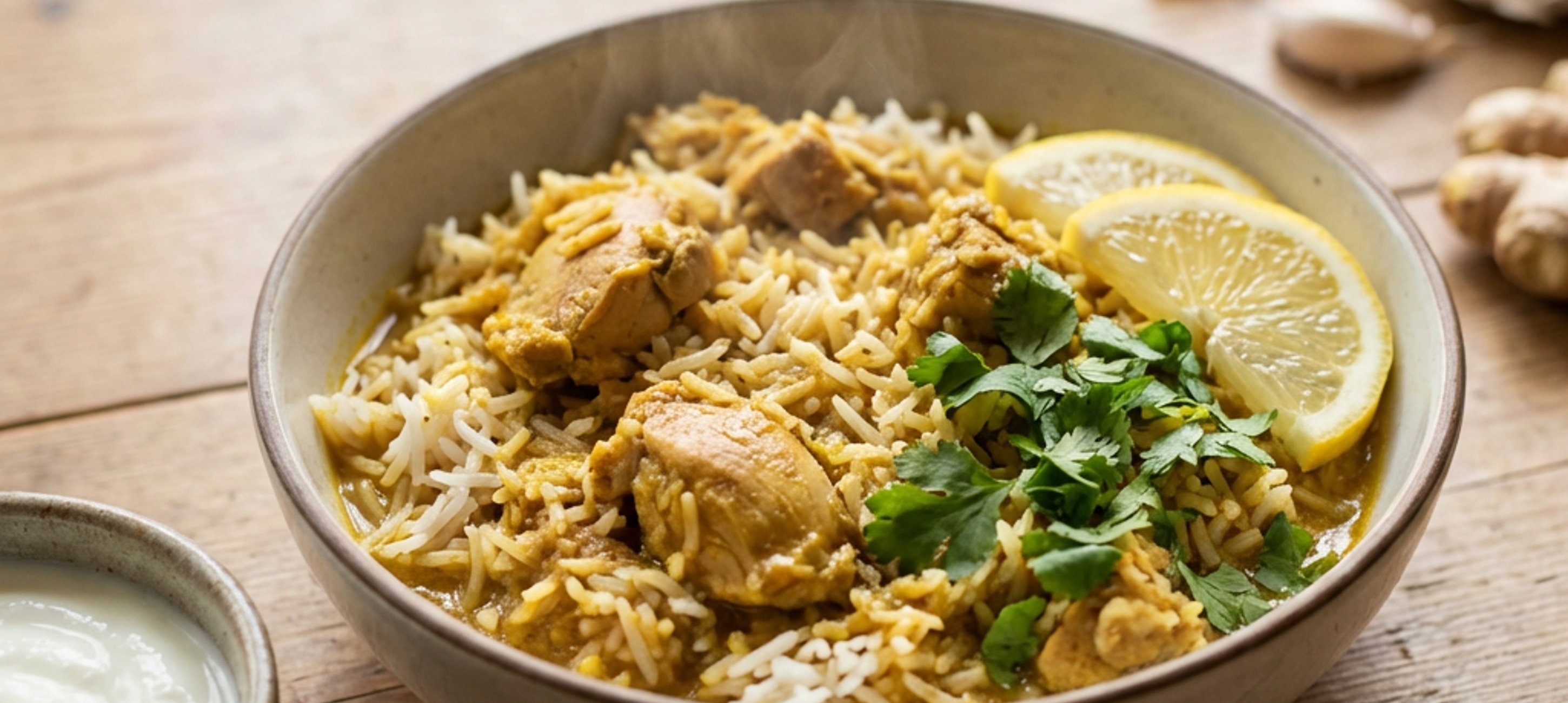 - 3Die gehackte Chilischote zu den Zwiebeln geben und kurz mitbraten. Dann die Kokosmilch hinzufügen und erhitzen. Den vorgegarten Reis in die kochende Kokosmilch geben und gut vermengen. Die marinierten Hähnchenstücke auf den Reis legen. Mit einem Deckel abdecken und das Biryani bei niedriger Hitze etwa 5–10 Minuten garen, bis sich die Aromen gut verbinden und der Reis perfekt durchgegart ist.