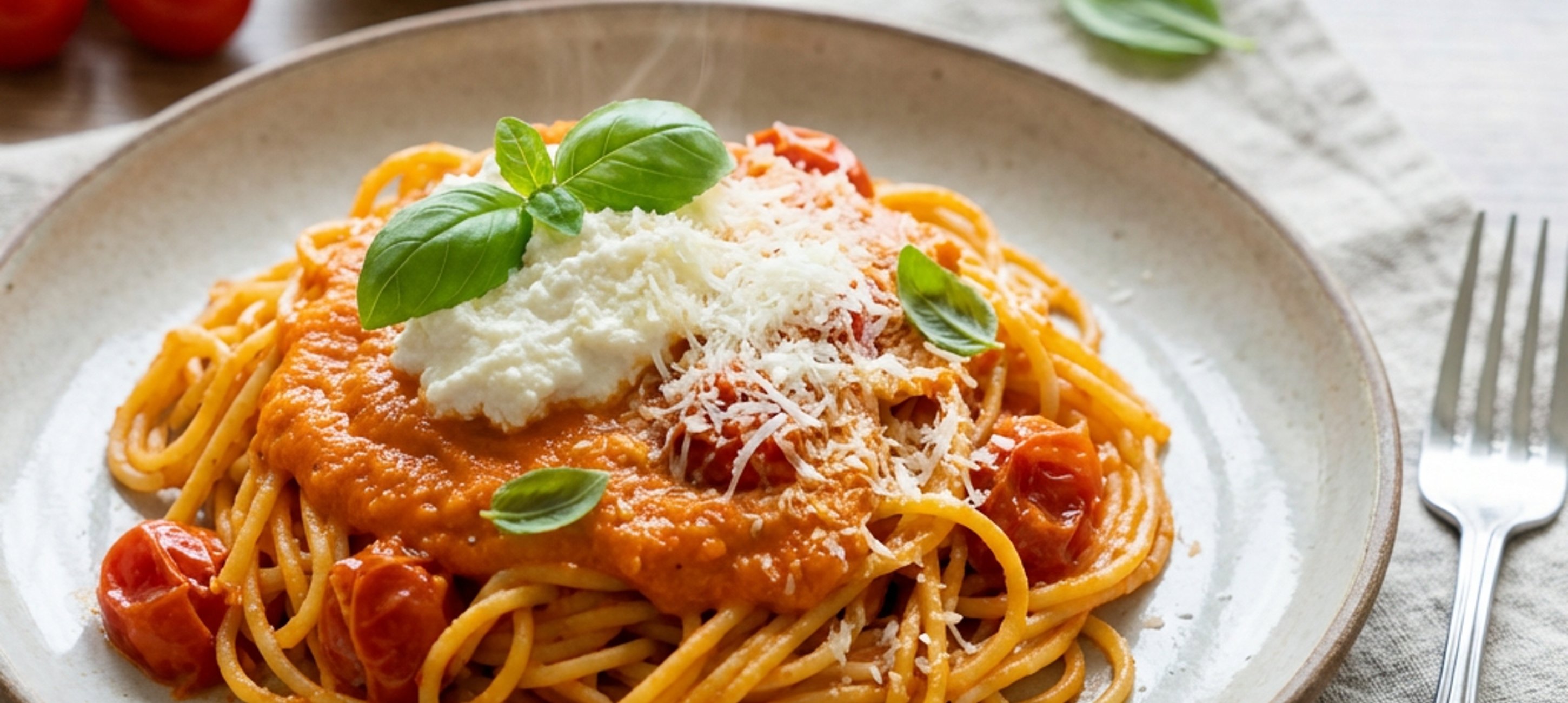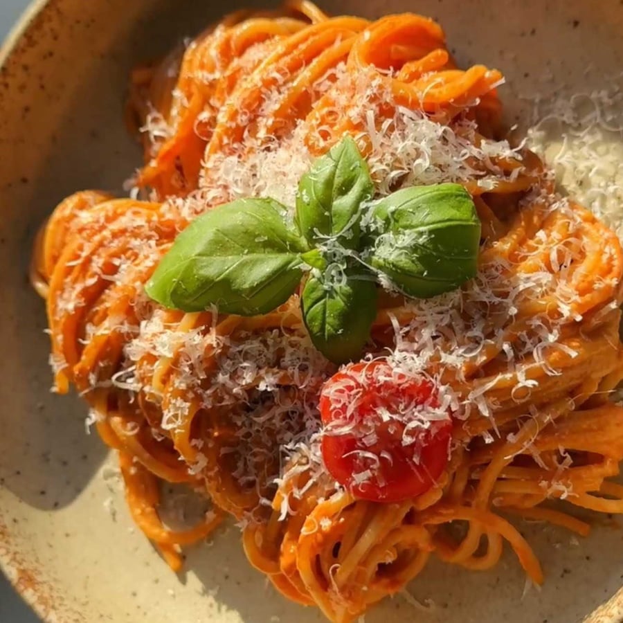 - 4Alles zusammen mit den getrockneten Tomaten, Basilikum und Ricotta zu einer cremigen Sauce pürieren. Spaghetti mit der Sauce vermengen, bei Bedarf etwas Nudelwasser hinzufügen. Auf Teller geben, mit Parmesan und frischem Basilikum servieren – und genießen!