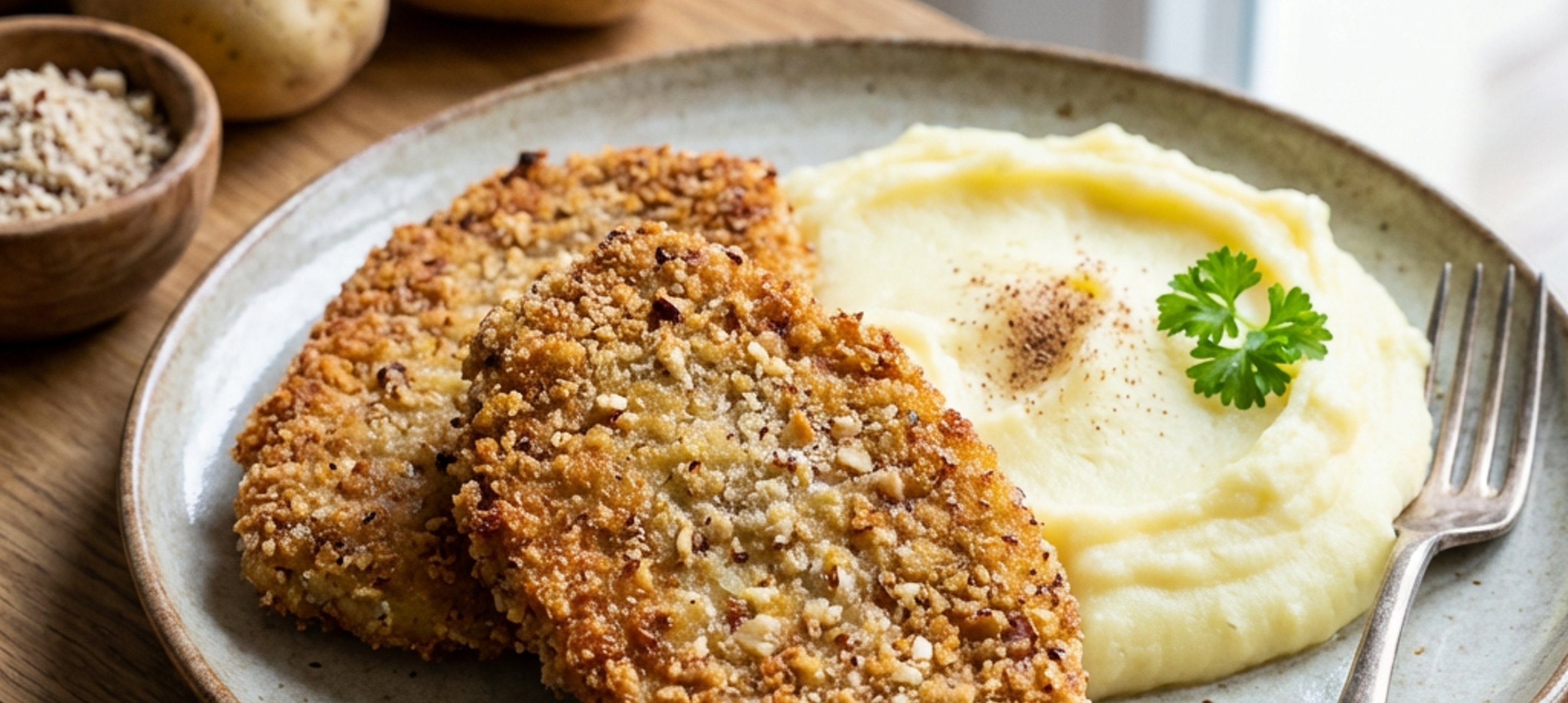 - 5Das Kartoffelpüree mit den Schnitzeln servieren. Dazu passen Preiselbeeren.
