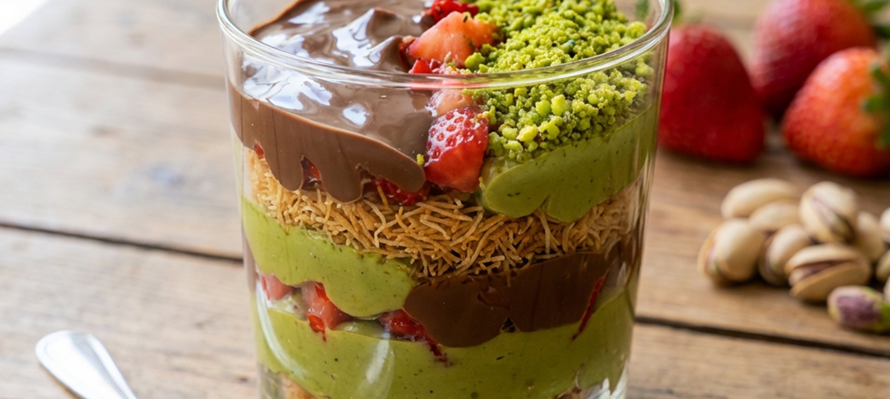 - 5Die gerösteten Nudeln in eine Schüssel geben und etwa die Hälfte der Pistaziencreme dazugeben und verrühren. Nach und nach die gehackten Erdbeeren in die Gläser schichten, die Pistaziennudelmischung, die geschmolzene Zartbitterschokolade und die Pistaziencreme dazugeben. Zum Schluss mit gehackten Pistazien garnieren.